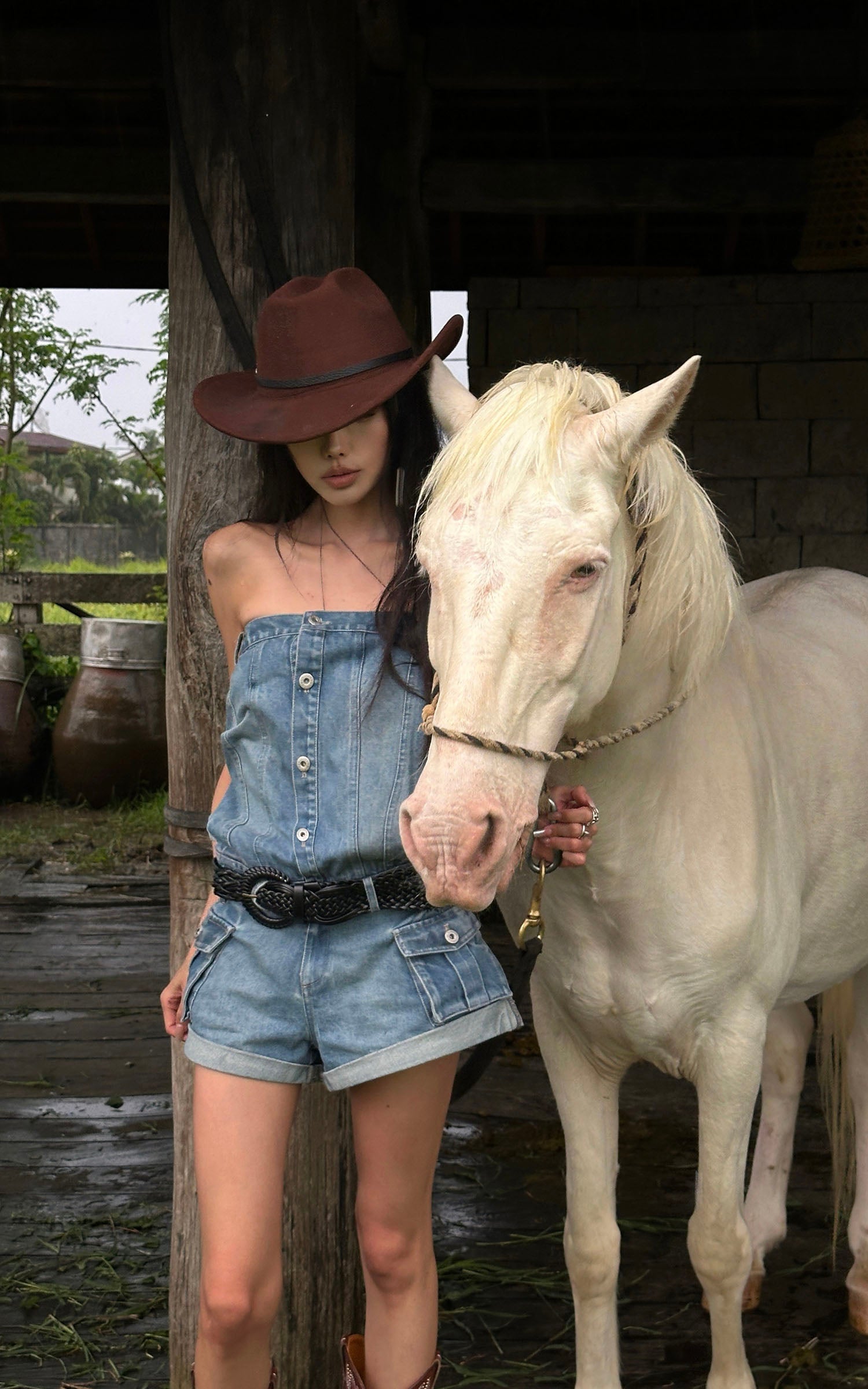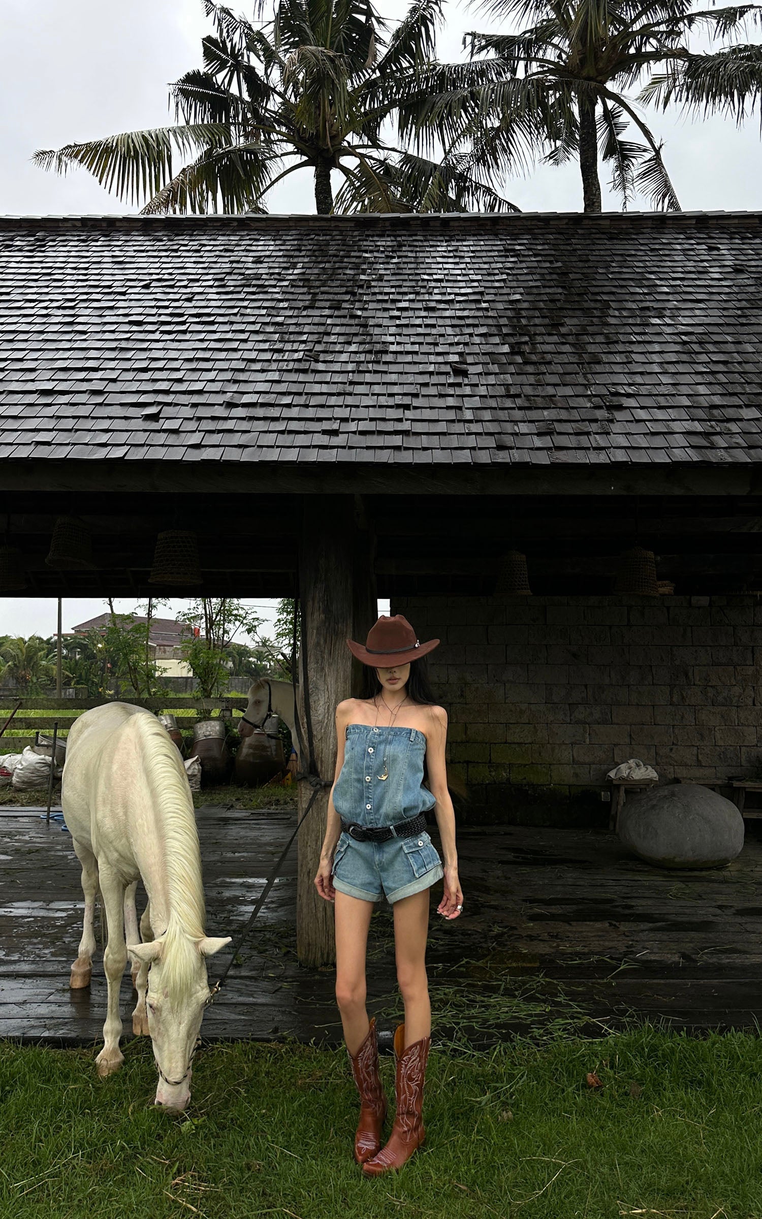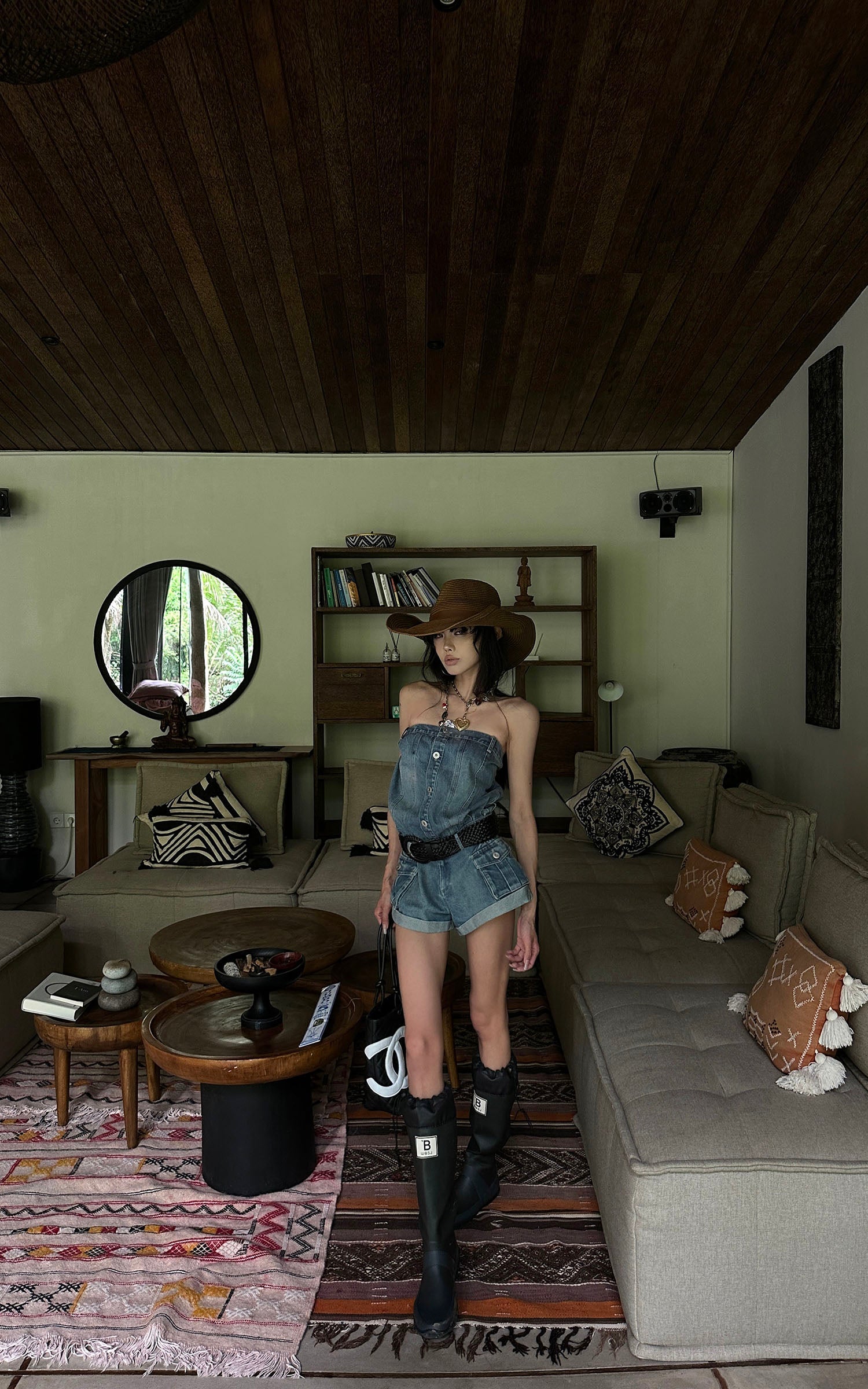 A reimagined silhouette built for contrast—this strapless denim romper merges structure and slouch with utilitarian intent. Featuring a ruched back panel, full button-up front, and oversized flap pockets, it channels a workwear language in a rebellious, shoulder-baring form. Pair it with boots, layer it up, or let it stand alone—it’s engineered for movement and nonconformity.