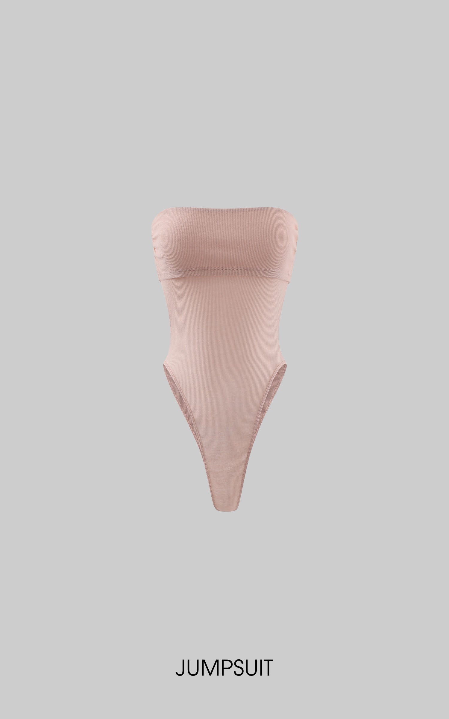 A sleek strapless silhouette designed to frame the shoulders and contour the body with a clean, sculpted line. Crafted from soft ribbed stretch fabric, it hugs naturally while maintaining comfort and flexibility throughout the day. The high-cut leg opening creates a sharp, elongated profile that pairs effortlessly with oversized denim or layered outerwear. Minimal, confident, and modern—an essential piece for building effortless street-driven looks.