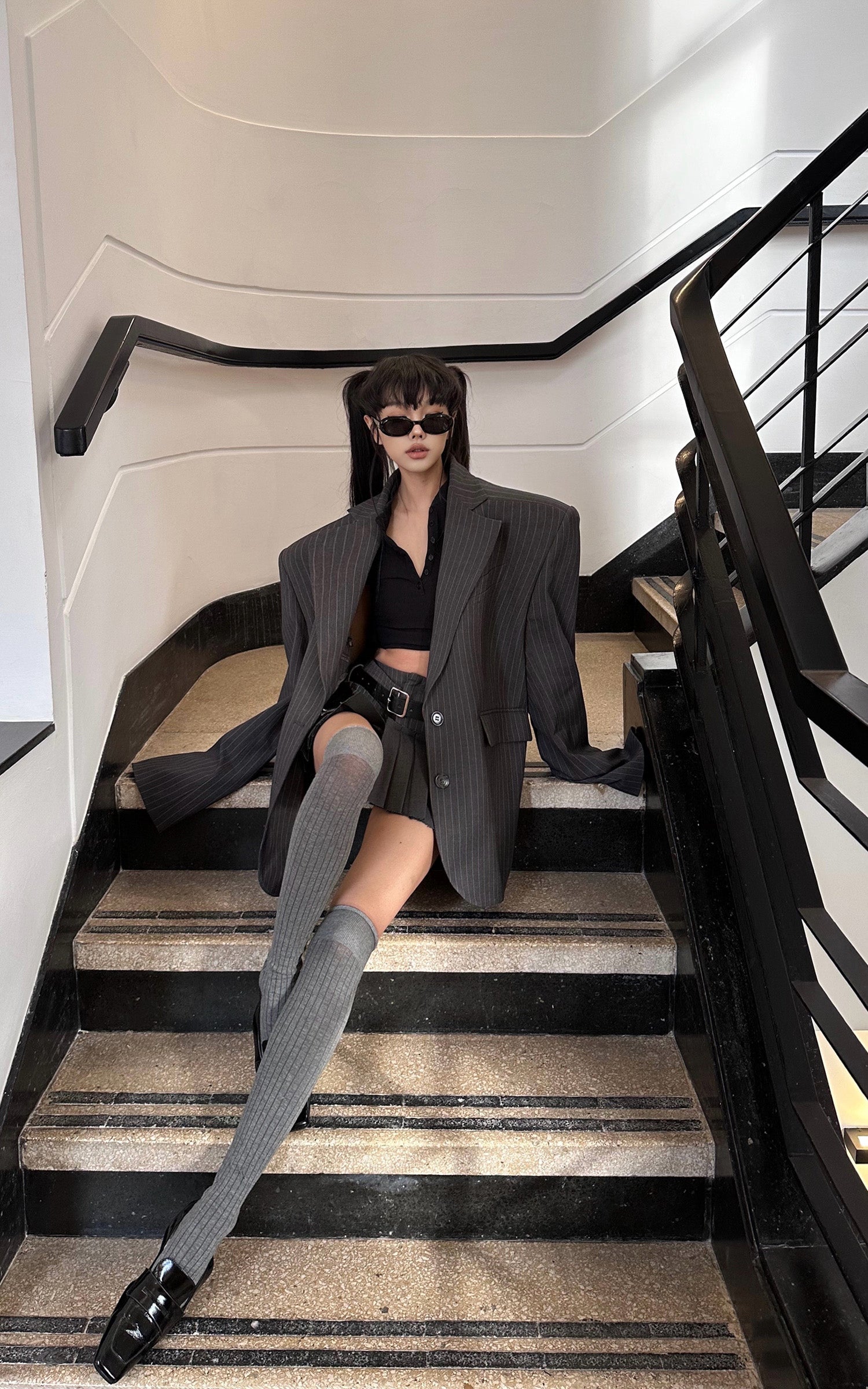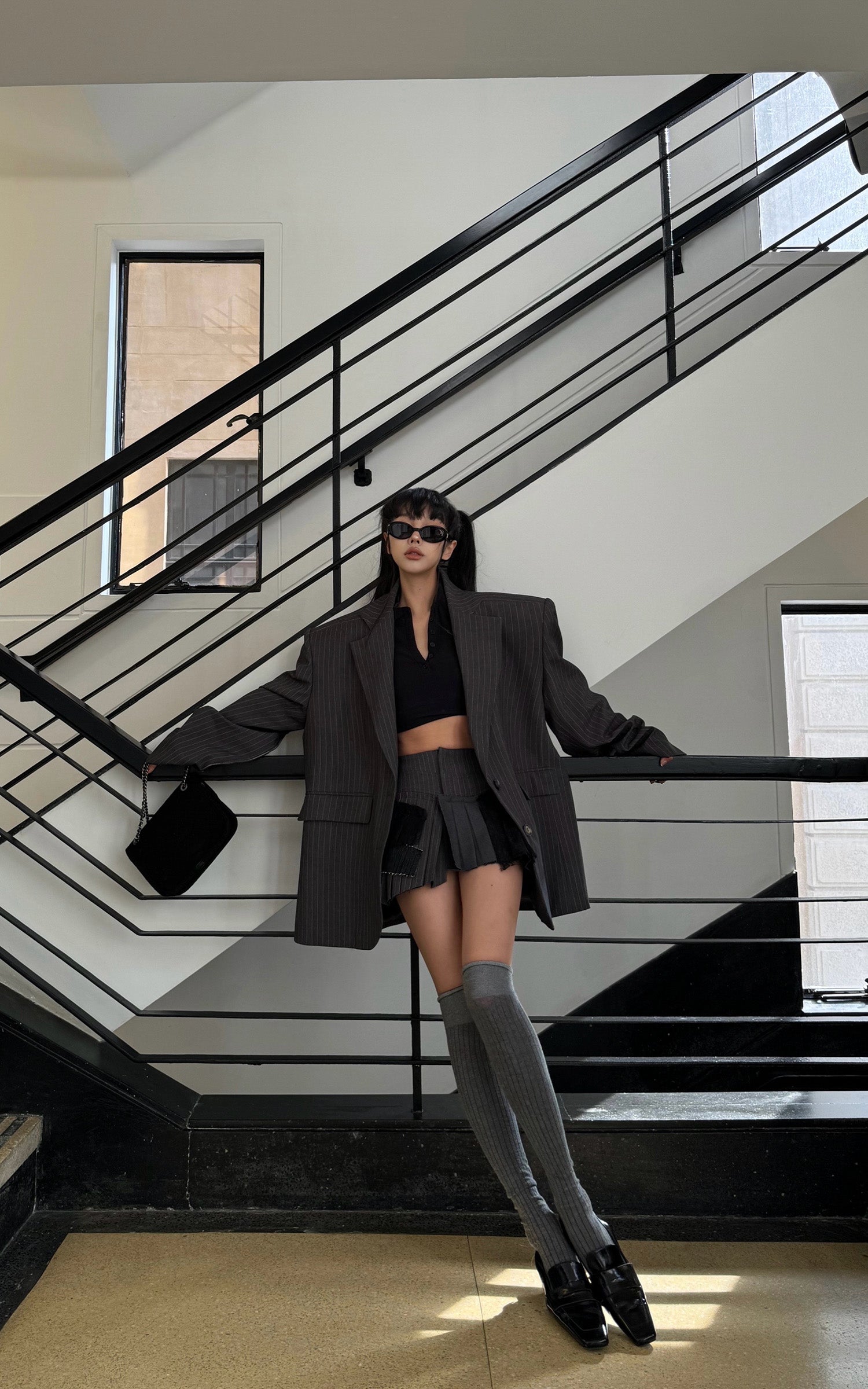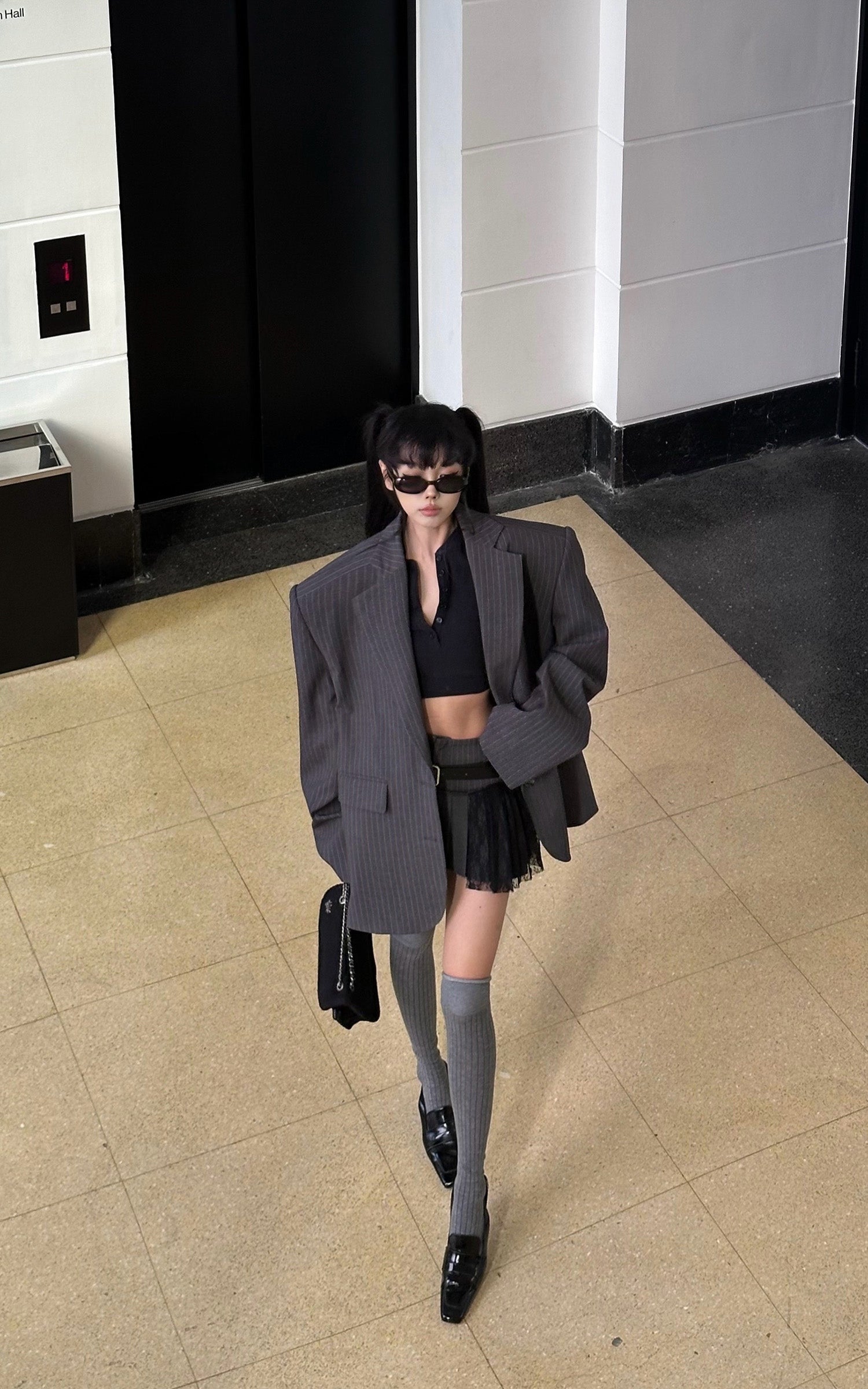 This structured H-cut blazer with exaggerated wide shoulders brings a bold, powerful silhouette. Paired with a pleated mini skirt featuring a double waistband and multi-layered design, this set blends sharp tailoring with playful layering. Available in black and white, it’s a statement-making look perfect for elevating your streetwear wardrobe.