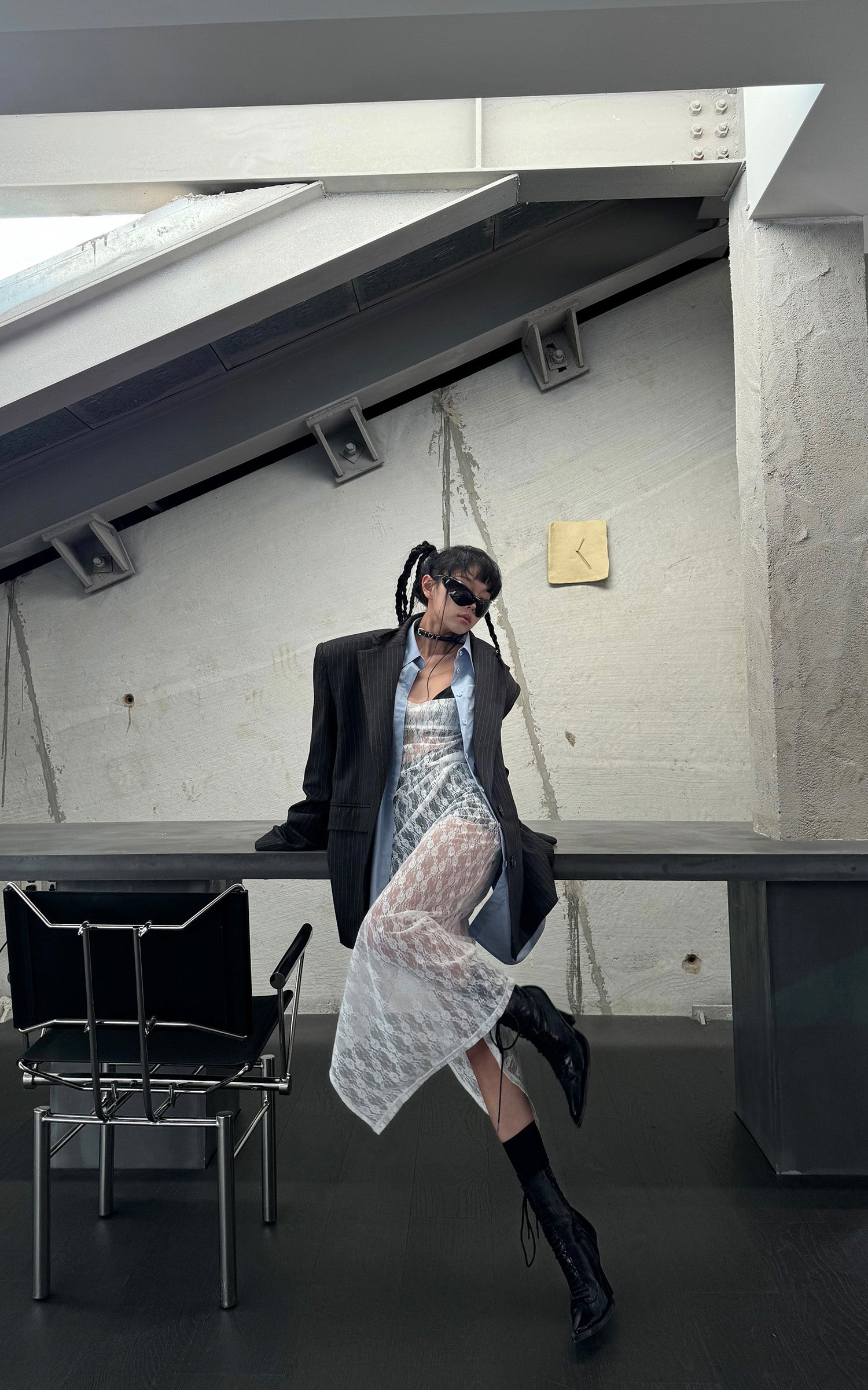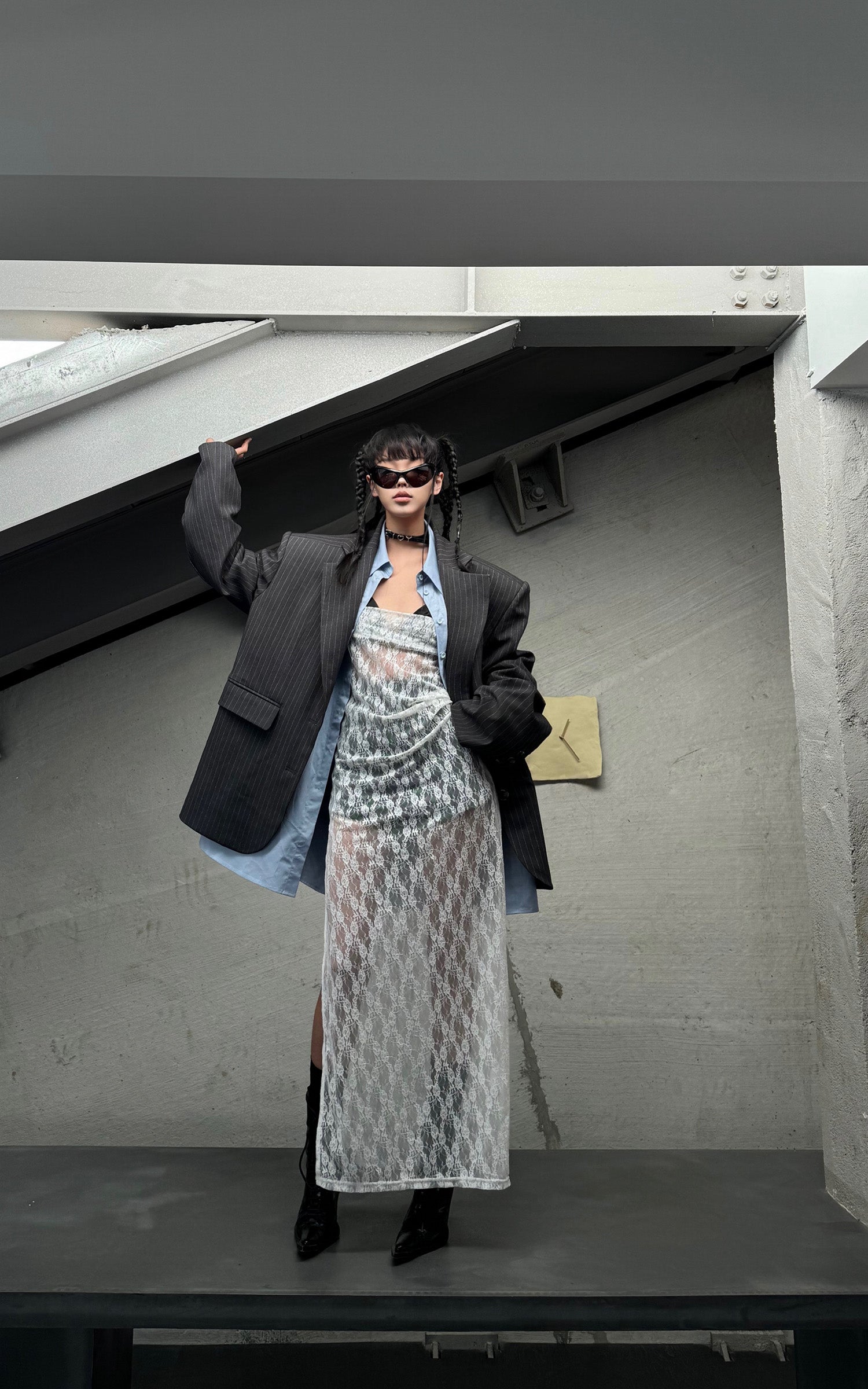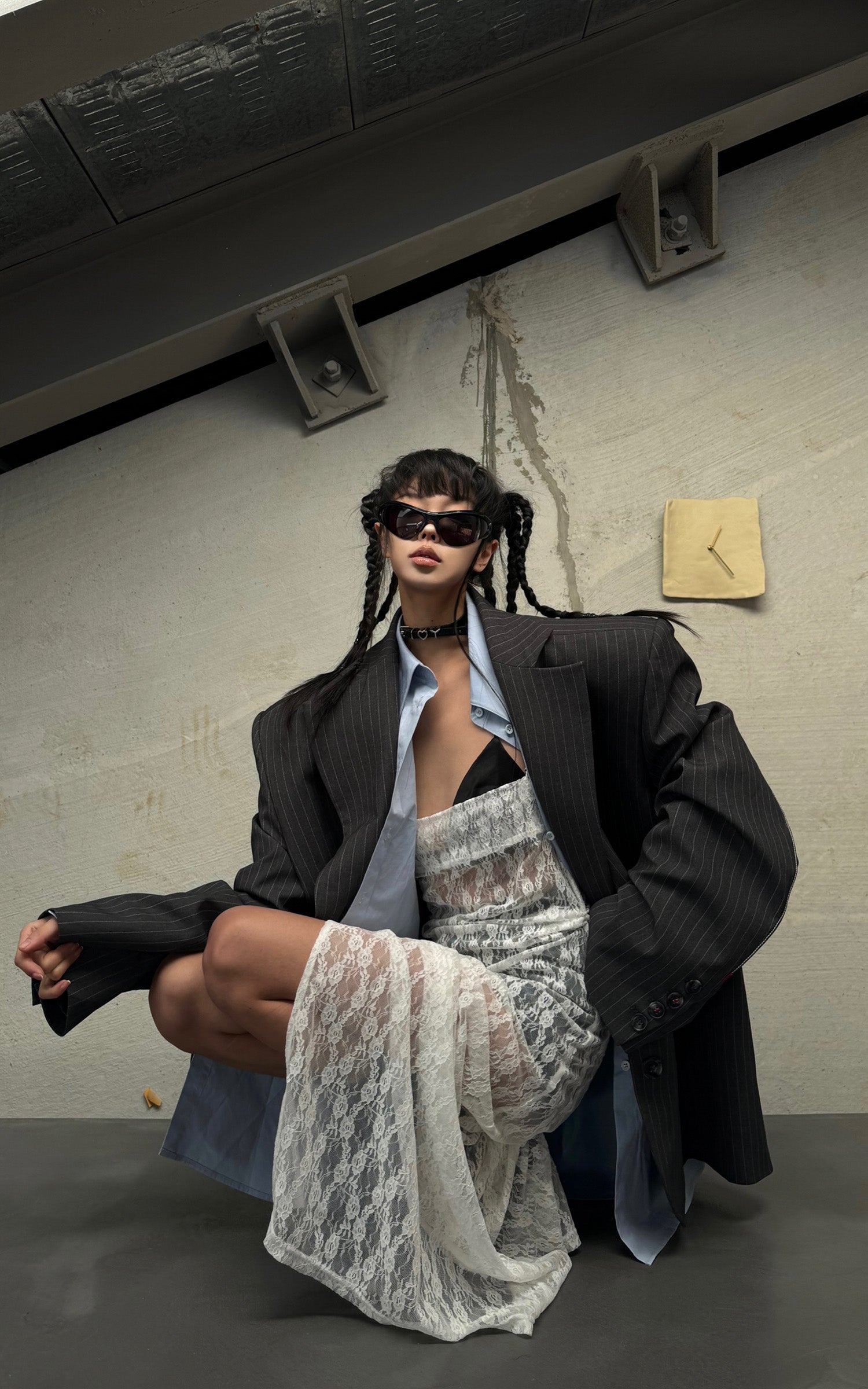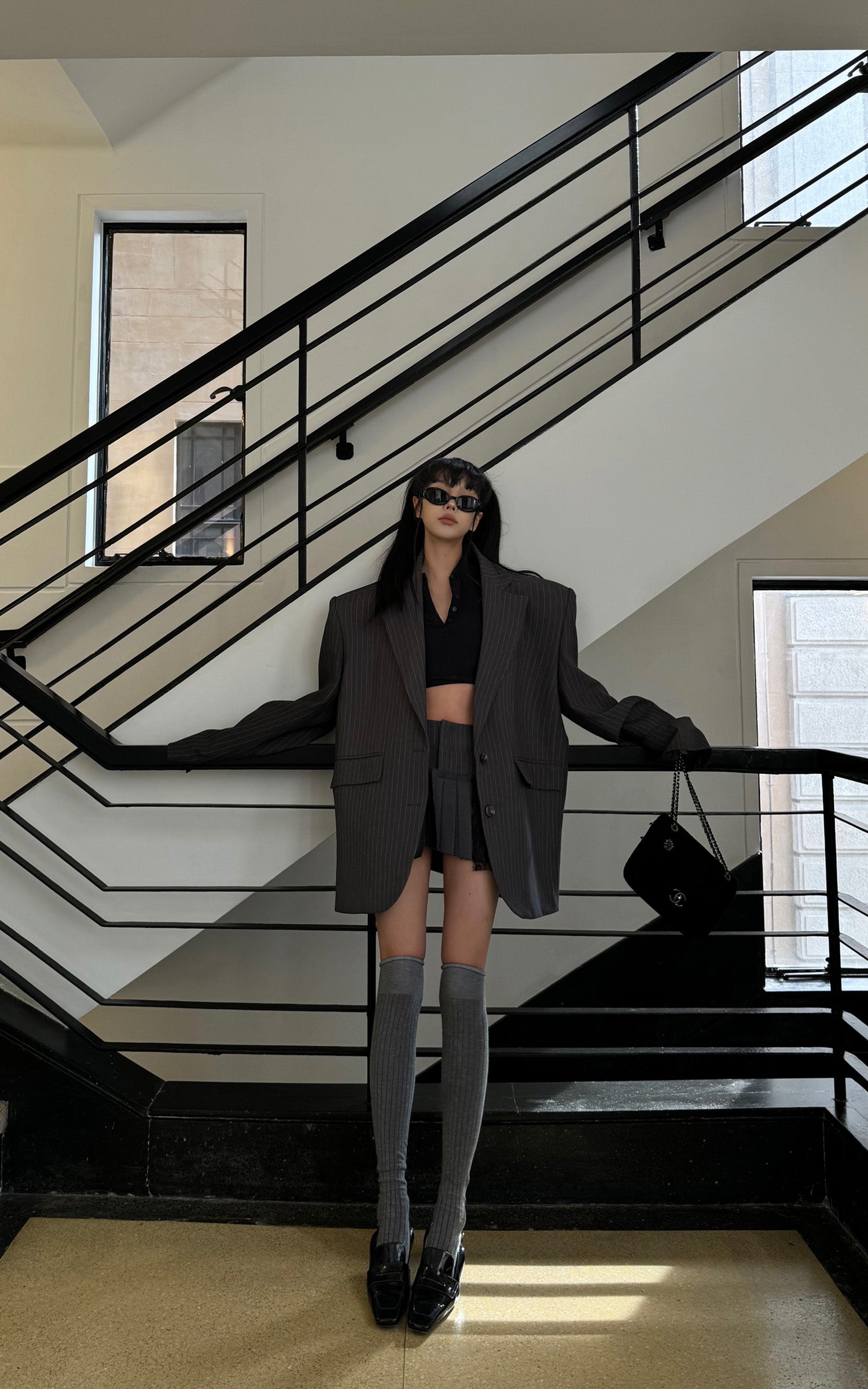 This structured H-cut blazer with exaggerated wide shoulders brings a bold, powerful silhouette. Paired with a pleated mini skirt featuring a double waistband and multi-layered design, this set blends sharp tailoring with playful layering. Available in black and white, it’s a statement-making look perfect for elevating your streetwear wardrobe.