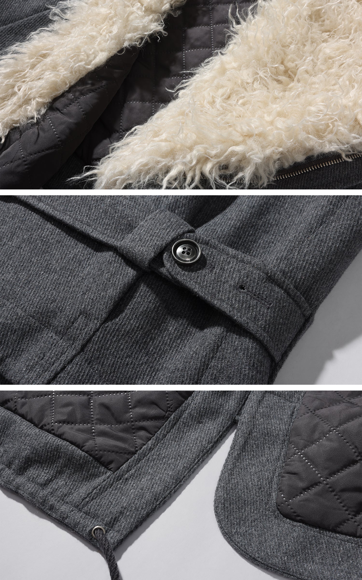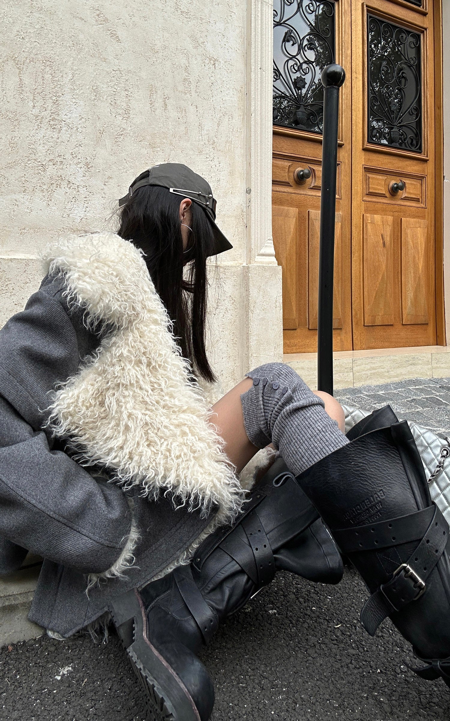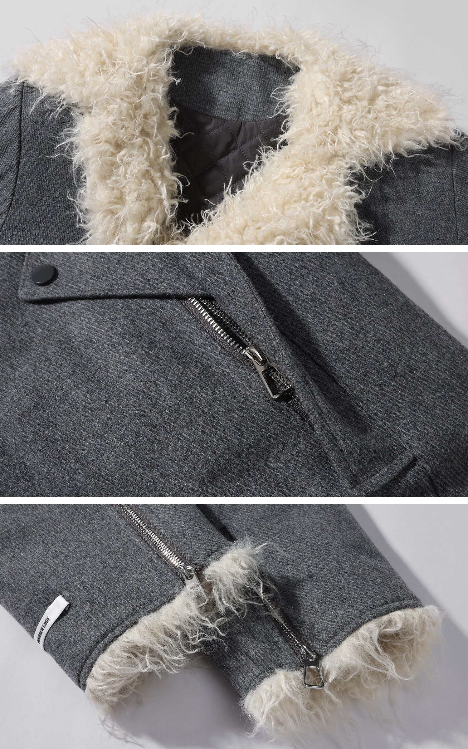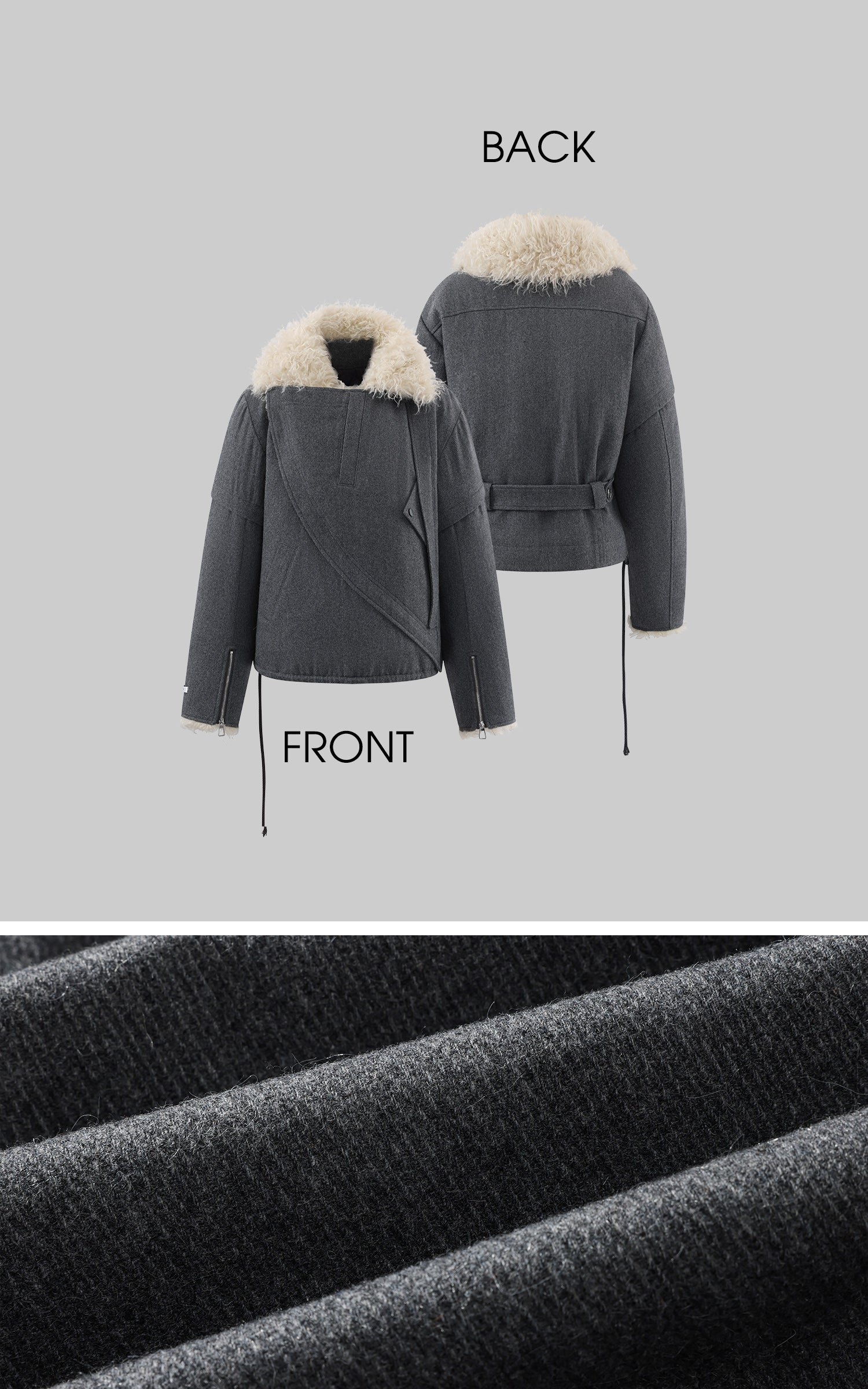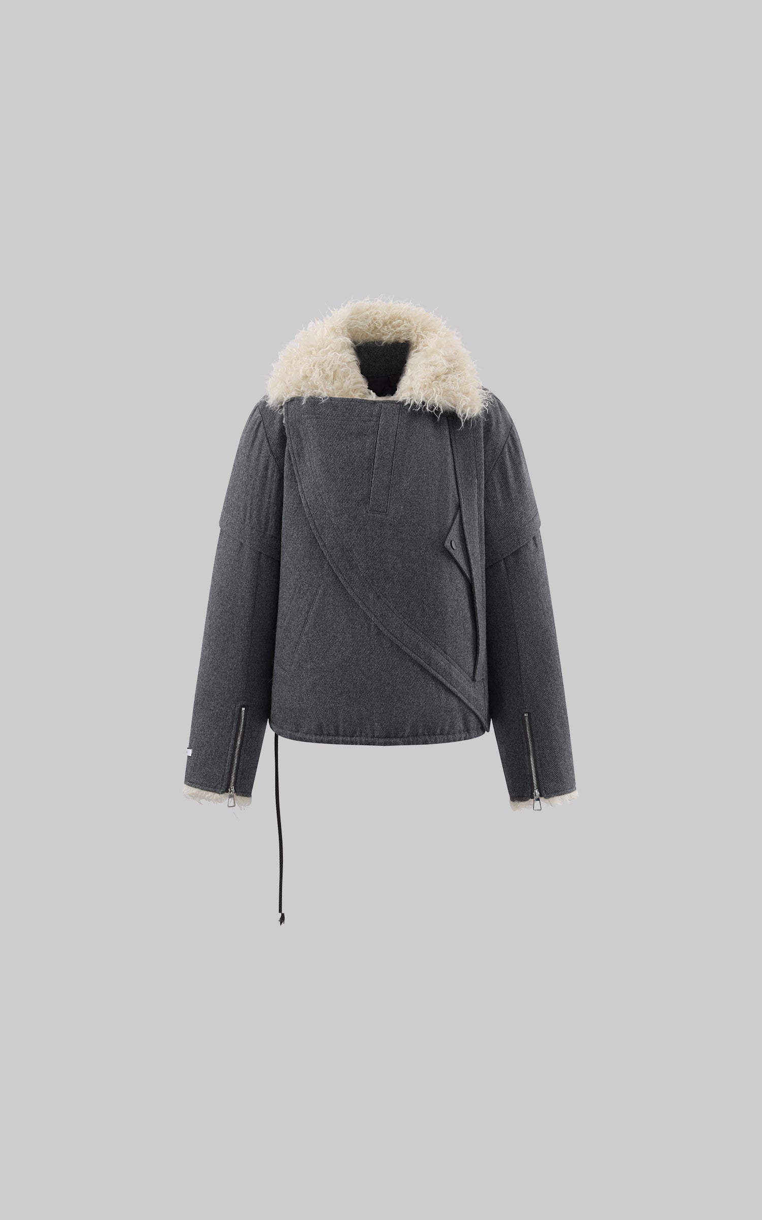 Built for winter edge, this jacket merges a sculpted wrap construction with a voluminous faux-shearling collar that frames the silhouette in bold contrast. The dense wool-blend shell adds structure while the quilted lining delivers warmth without bulk. Zippered sleeves, extended panels, and subtle strap details refine the piece with utilitarian attitude. Designed for layering and urban movement, it brings a directional, statement-driven energy to cold-season outfits.
