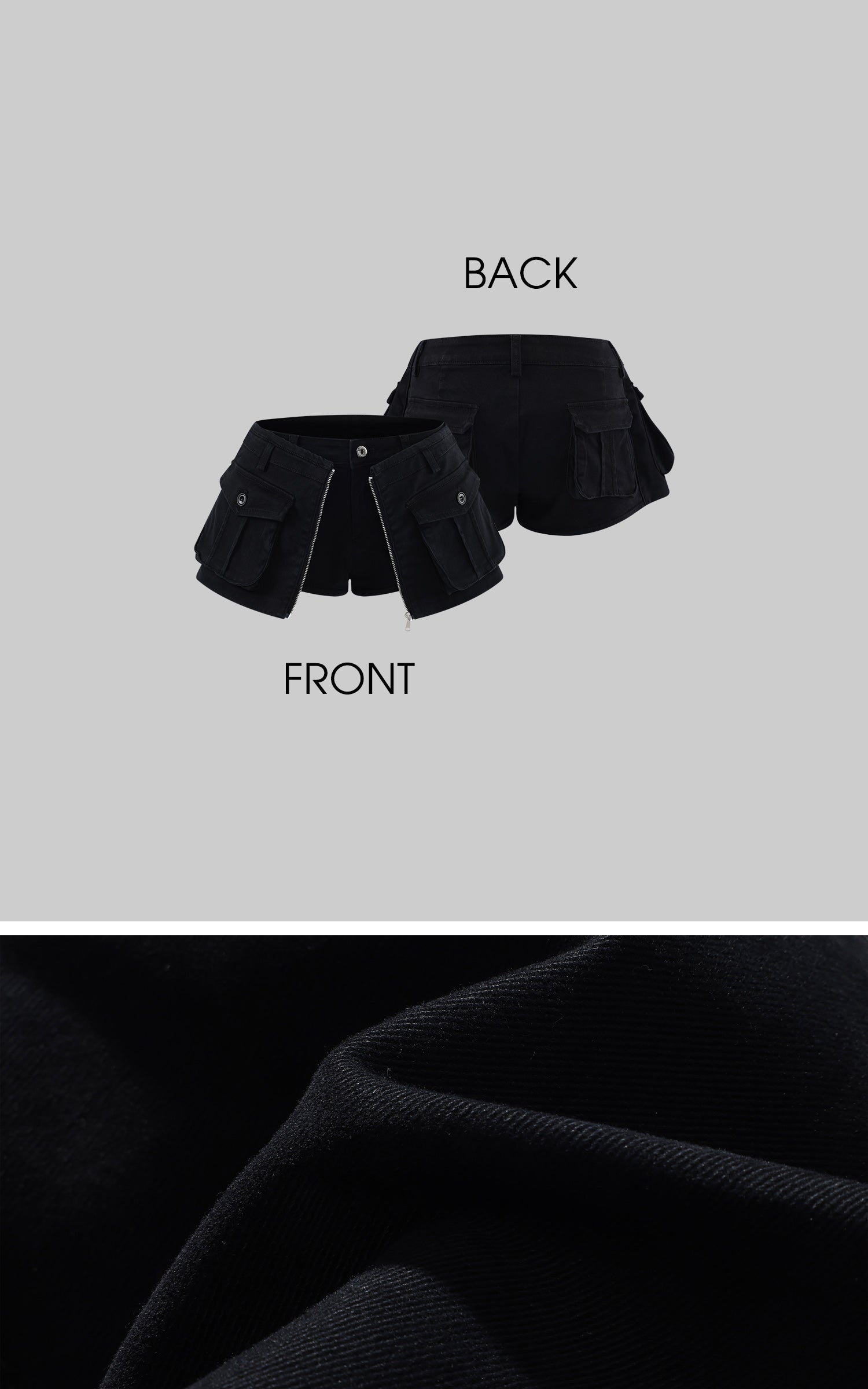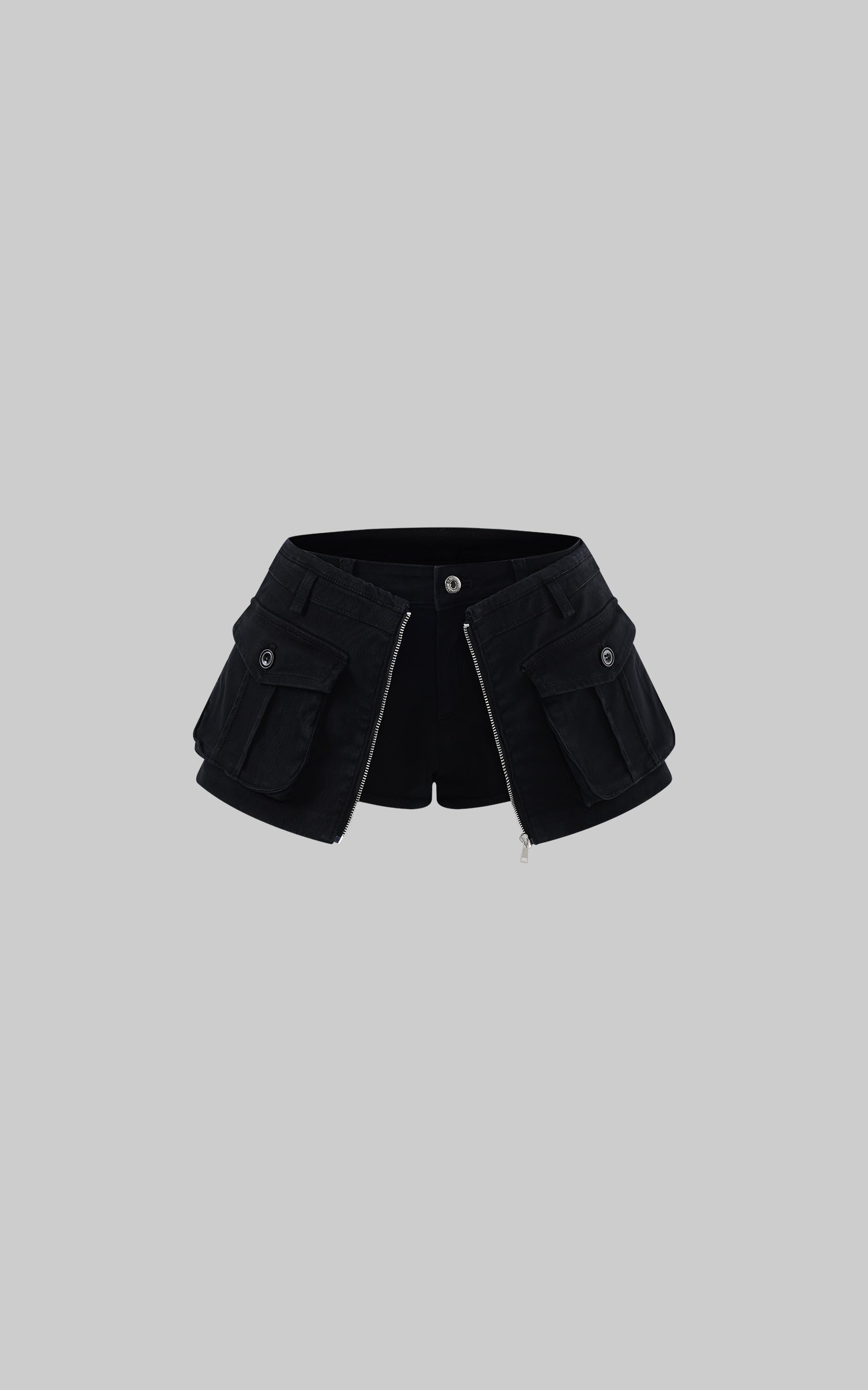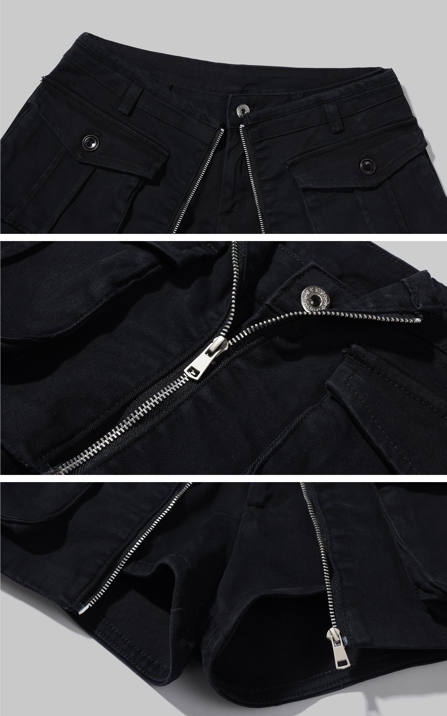Designed with a sharp, low-rise silhouette, these utility shorts balance structure and attitude. The exposed front zip elongates the line of the body, while layered flap pockets add depth and functional tension. Clean tailoring meets industrial hardware, creating a piece that feels deliberate and controlled. The fabric holds its form without stiffness, making it ideal for pairing with fitted knits or sculptural tops for a precise, modern look.