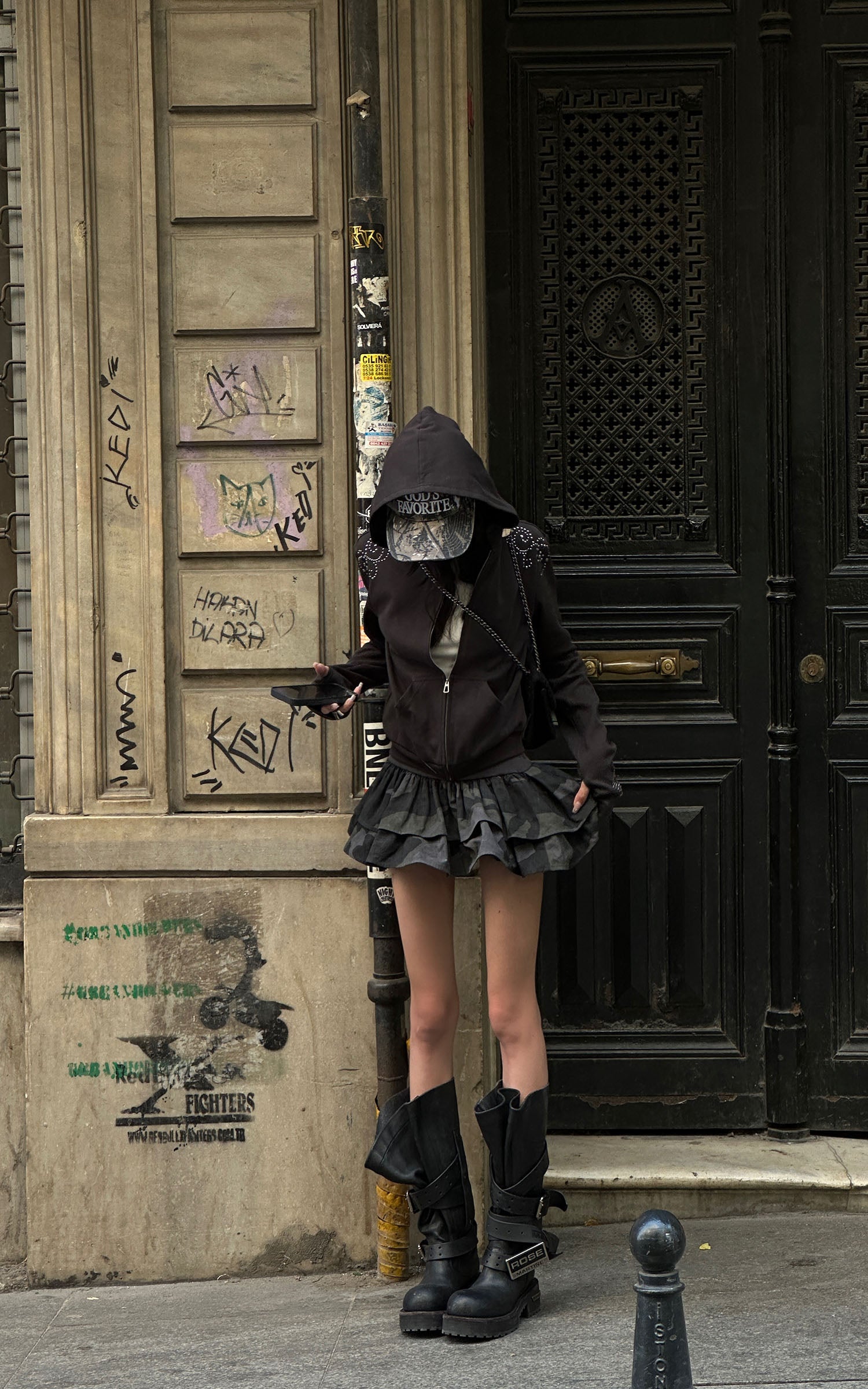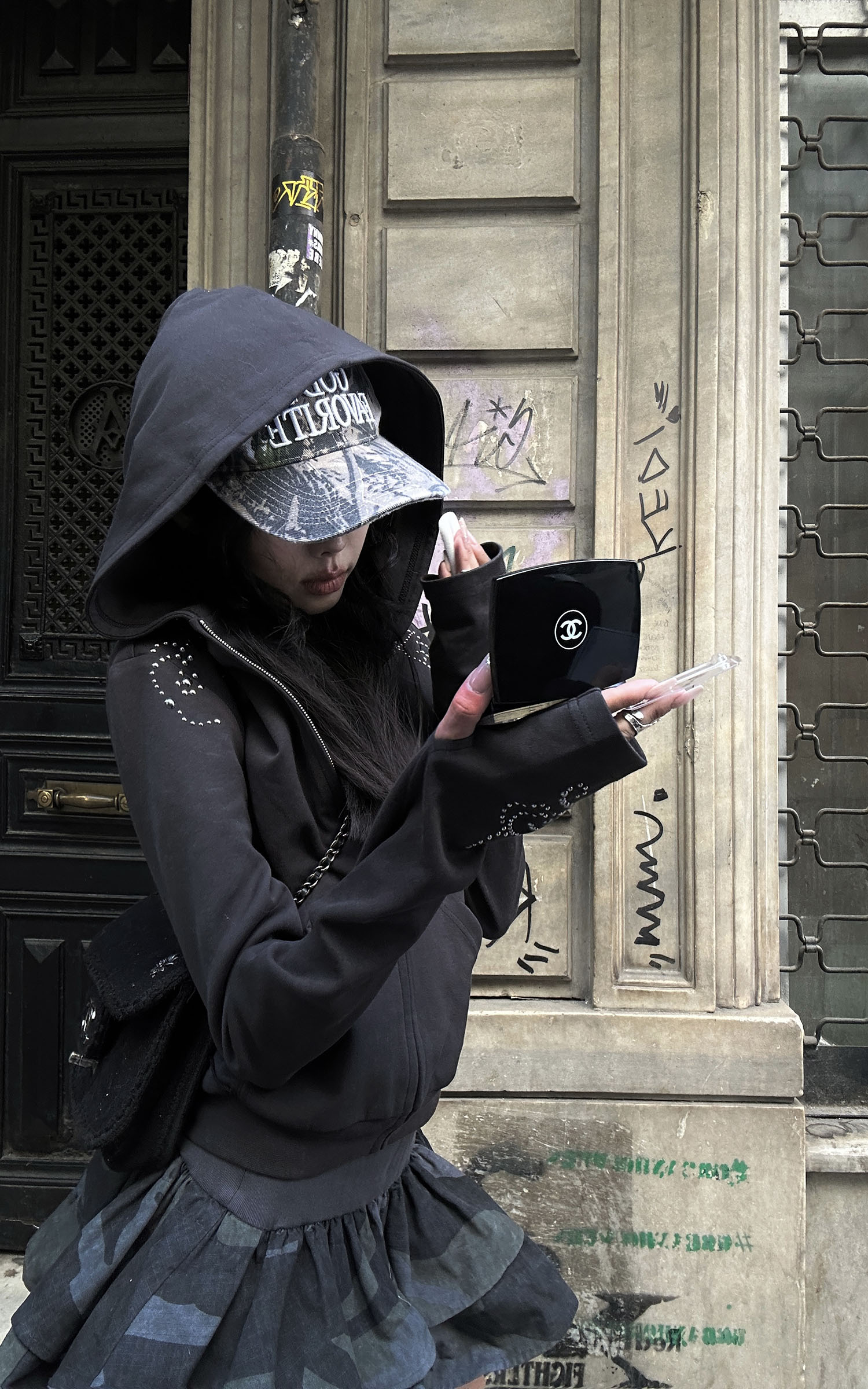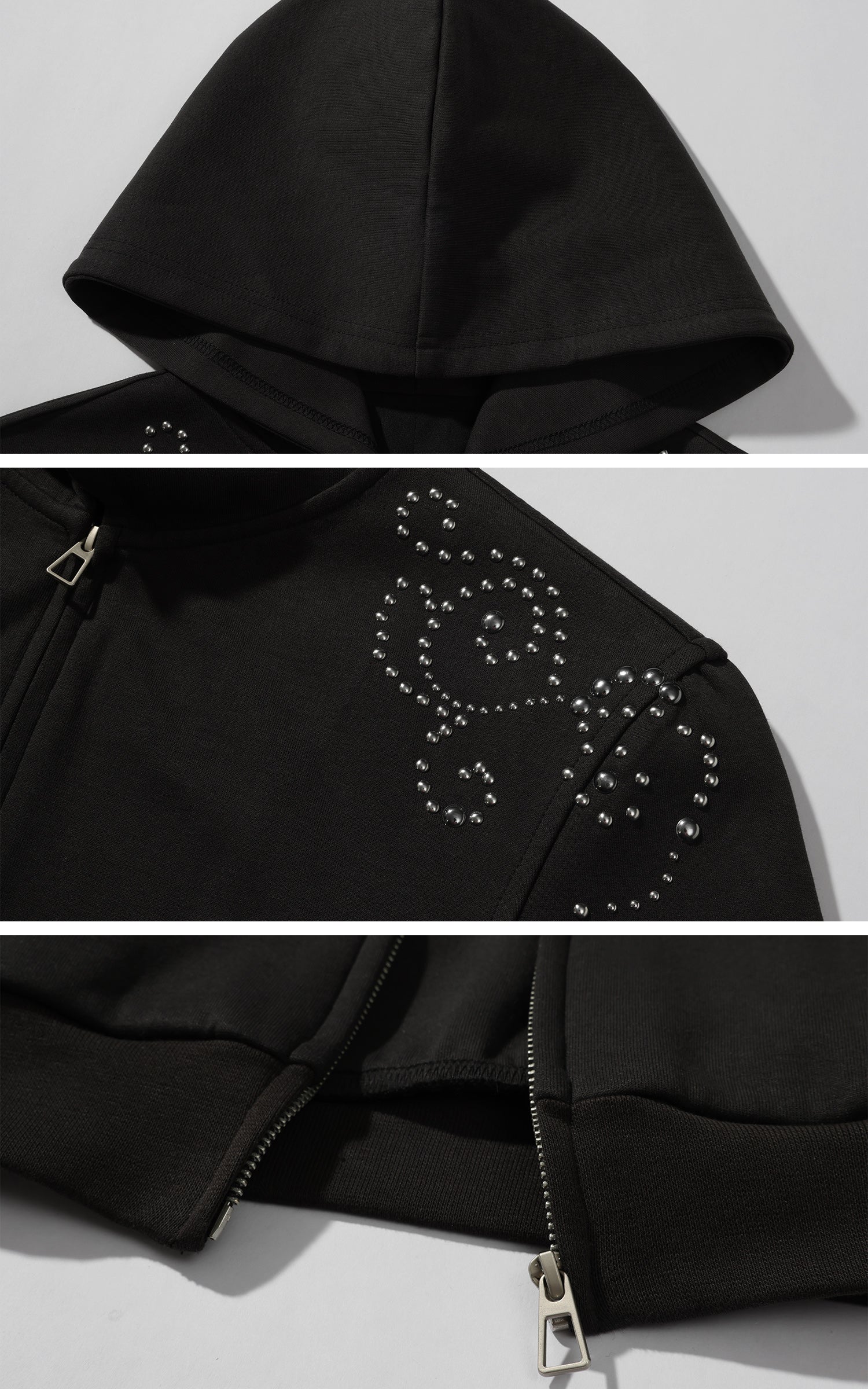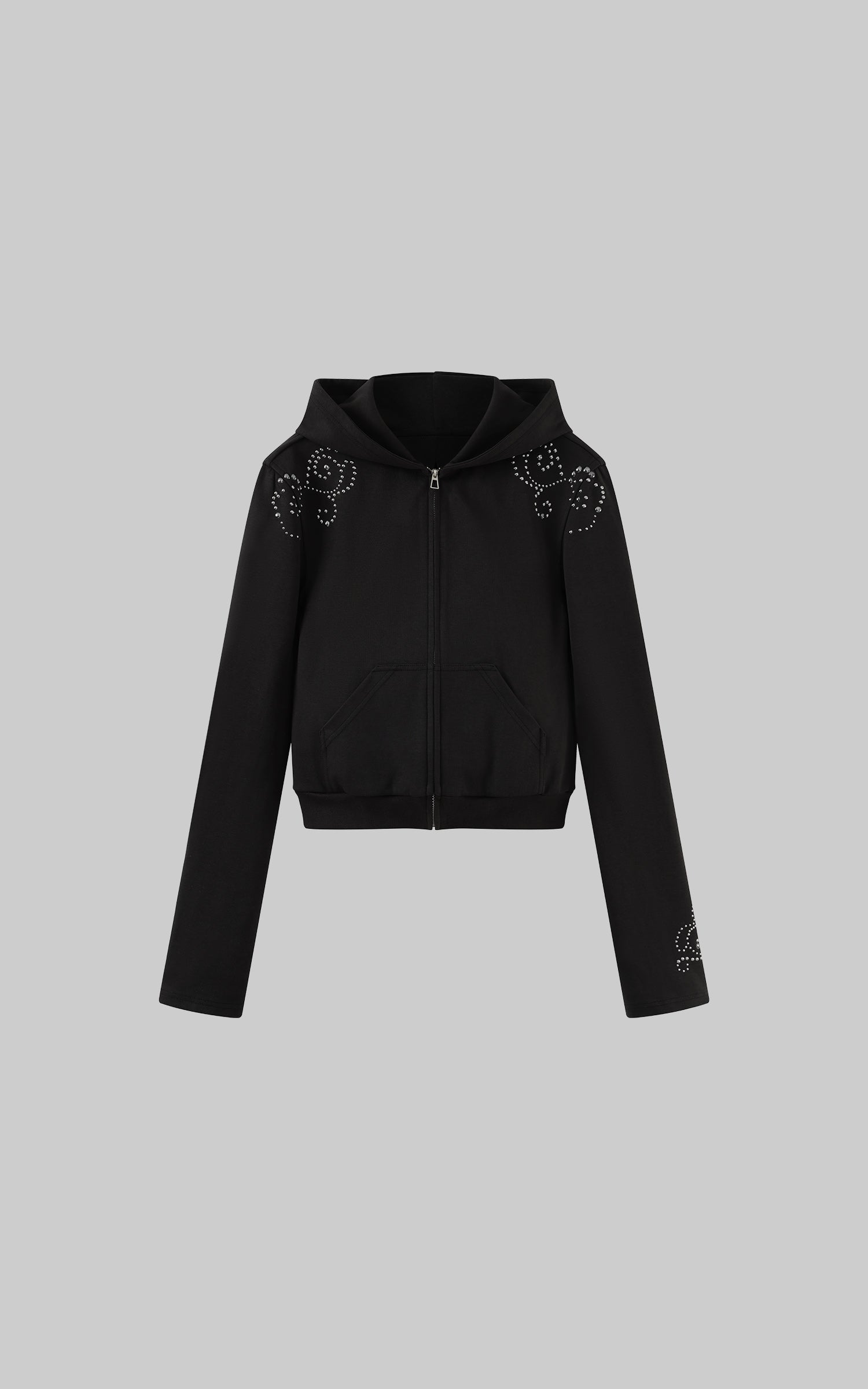 Crafted for city nights and unspoken moods, this zip-up hoodie blends street energy with sculpted precision. Embellished with spiraling studs across the shoulders and sleeves, the piece features an oversized hood, split cuffs, and a cropped silhouette that sits just at the waist. Layer it over mesh, pair it with skirts, or let it anchor a full monochrome look—it holds its own, quietly and powerfully.