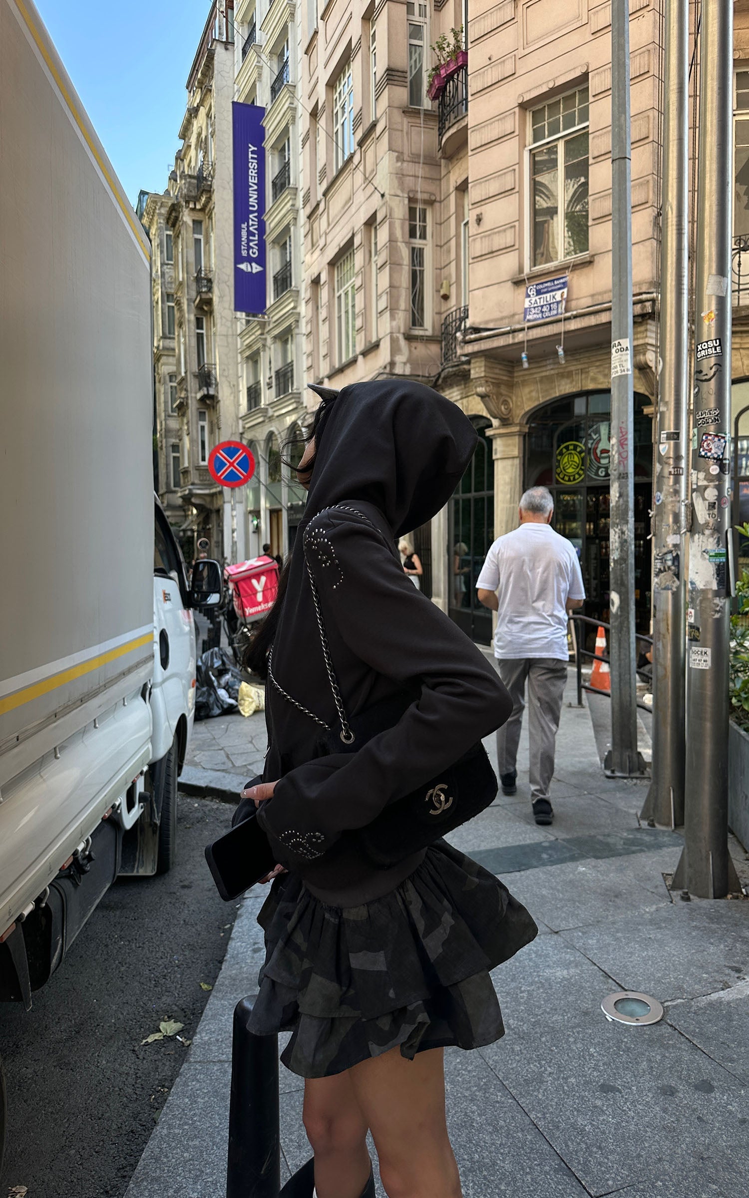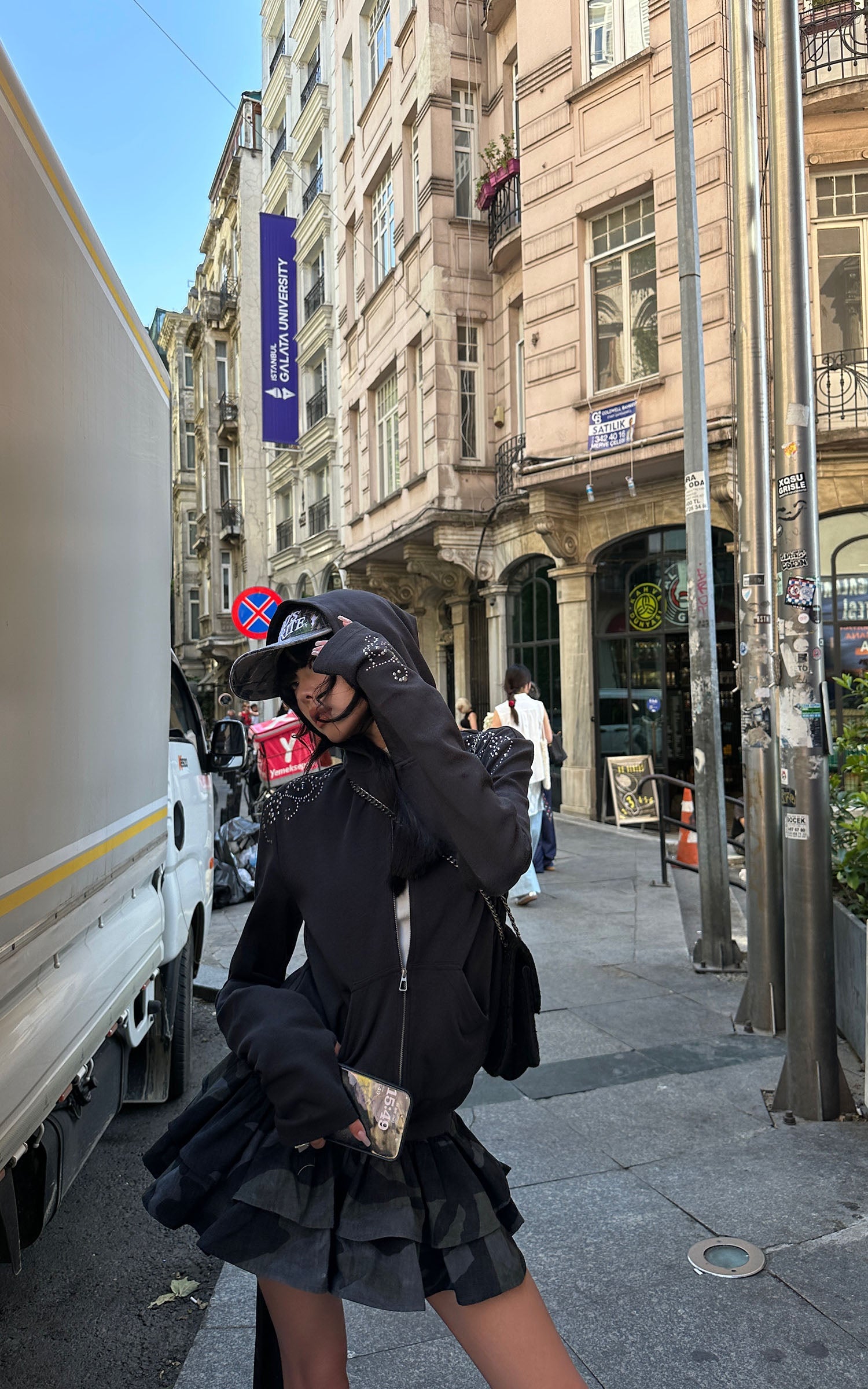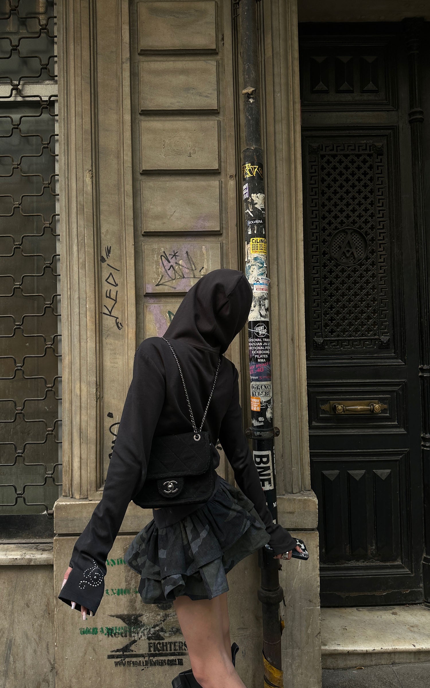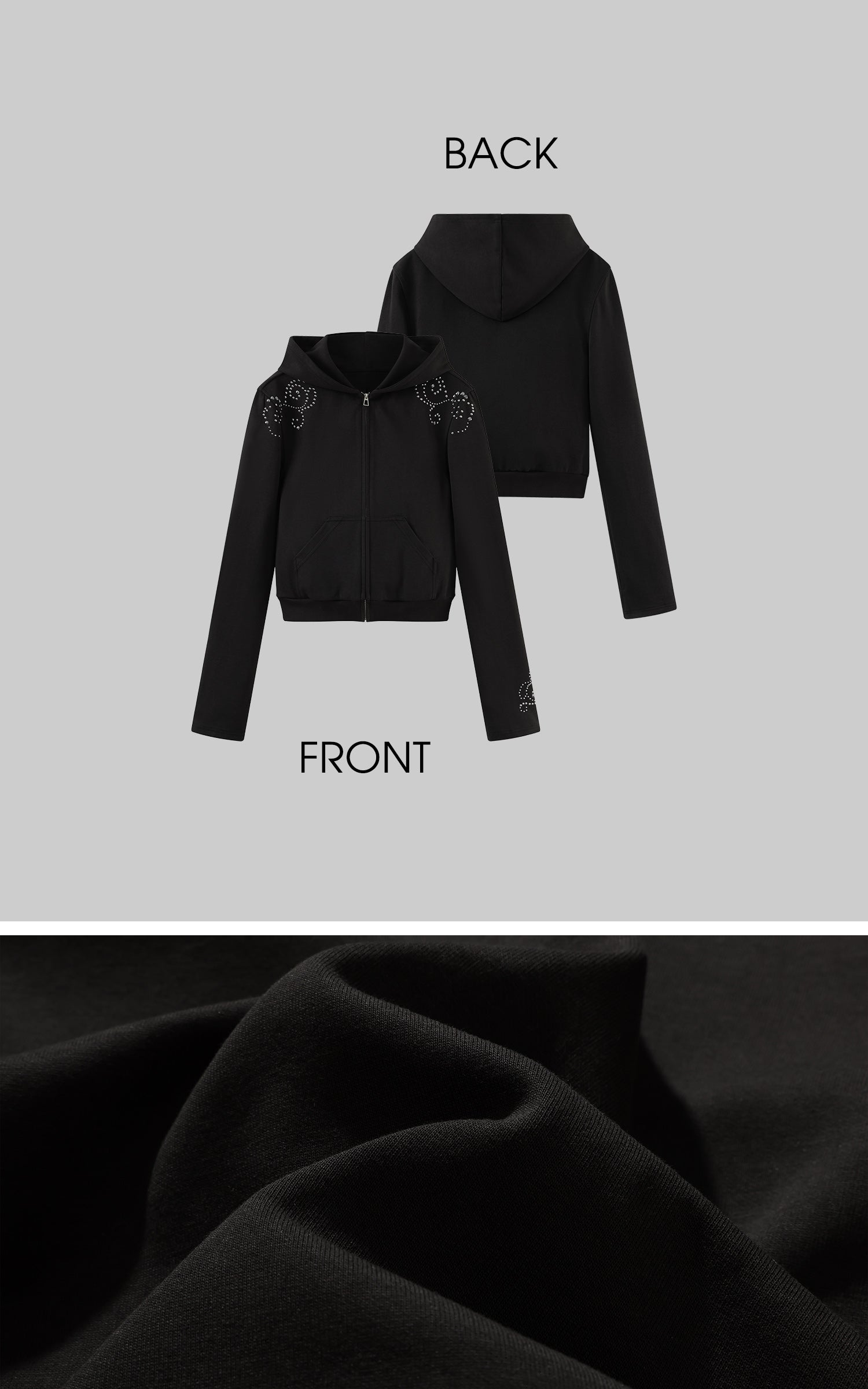 Crafted for city nights and unspoken moods, this zip-up hoodie blends street energy with sculpted precision. Embellished with spiraling studs across the shoulders and sleeves, the piece features an oversized hood, split cuffs, and a cropped silhouette that sits just at the waist. Layer it over mesh, pair it with skirts, or let it anchor a full monochrome look—it holds its own, quietly and powerfully.