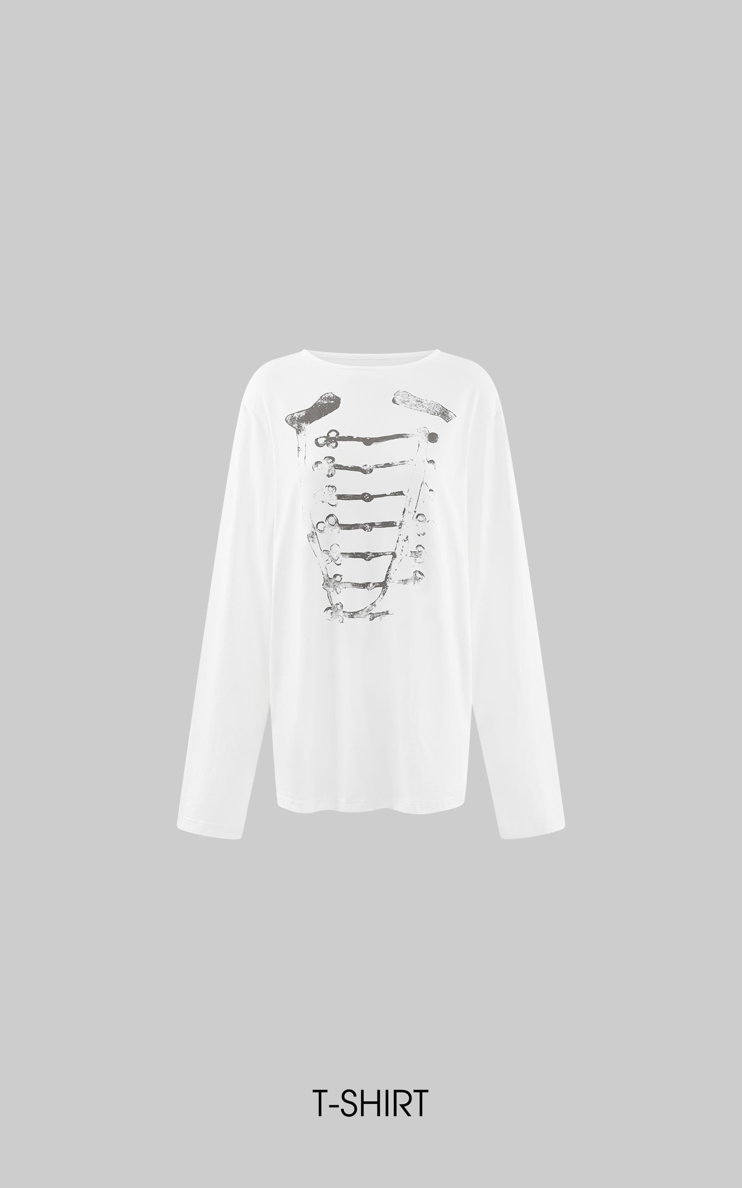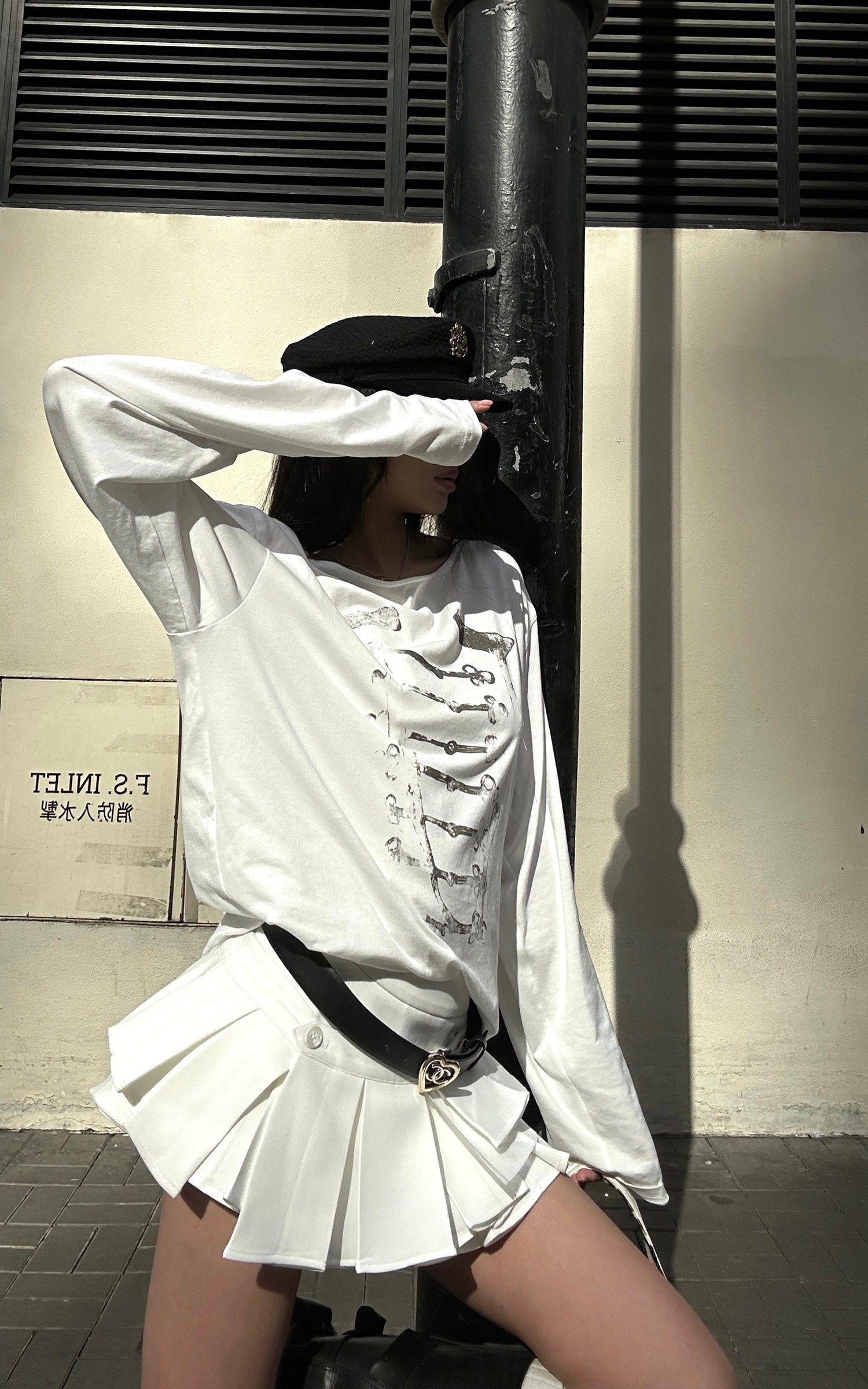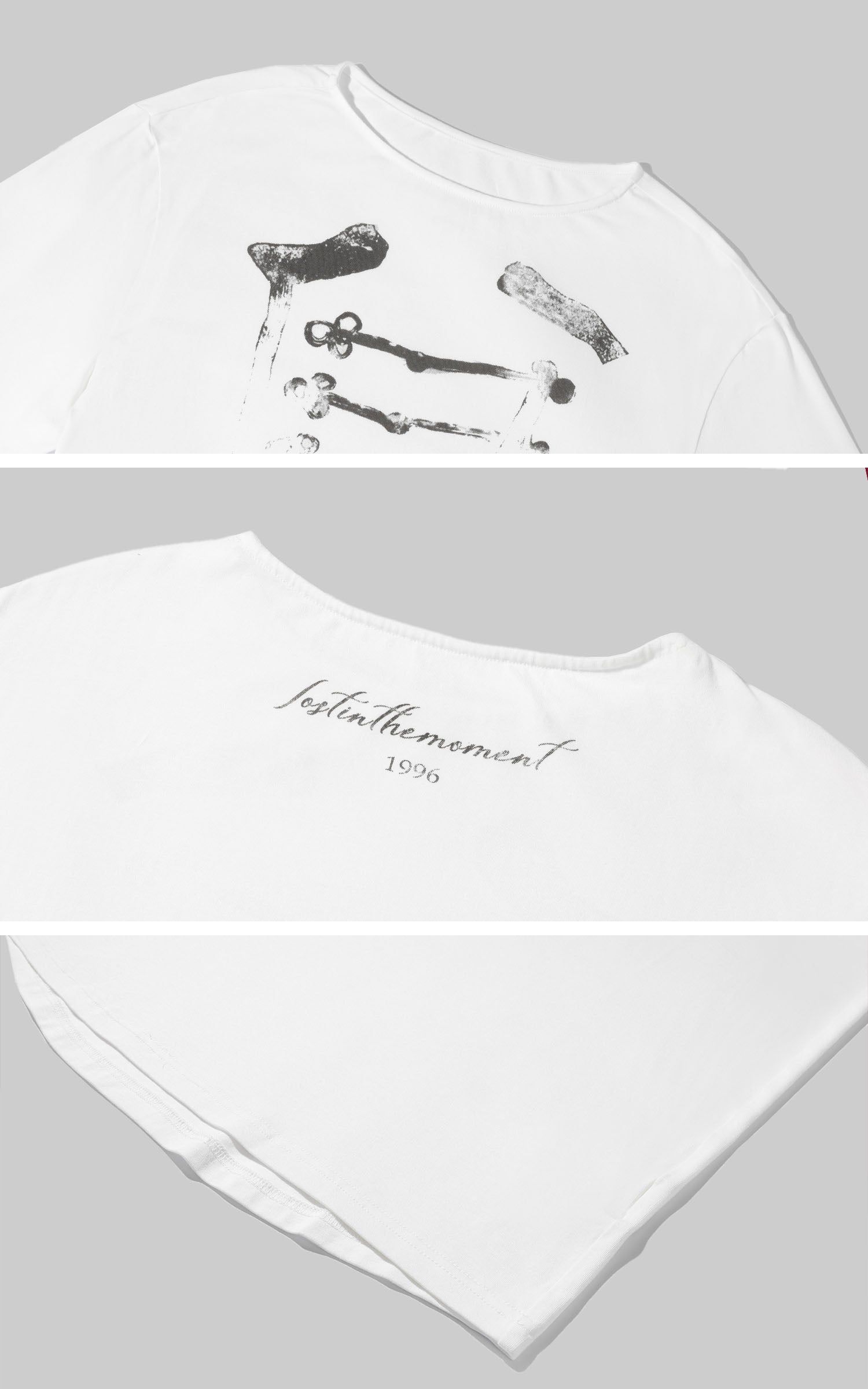 A distressed military-inspired graphic disrupts the clean white base, creating subtle yet sharp visual tension. The relaxed drop-shoulder silhouette drapes effortlessly, while the loose neckline adds an undone edge. Crafted from soft, breathable fabric, it styles seamlessly on its own or layered for a cool, Y2K-infused street attitude.