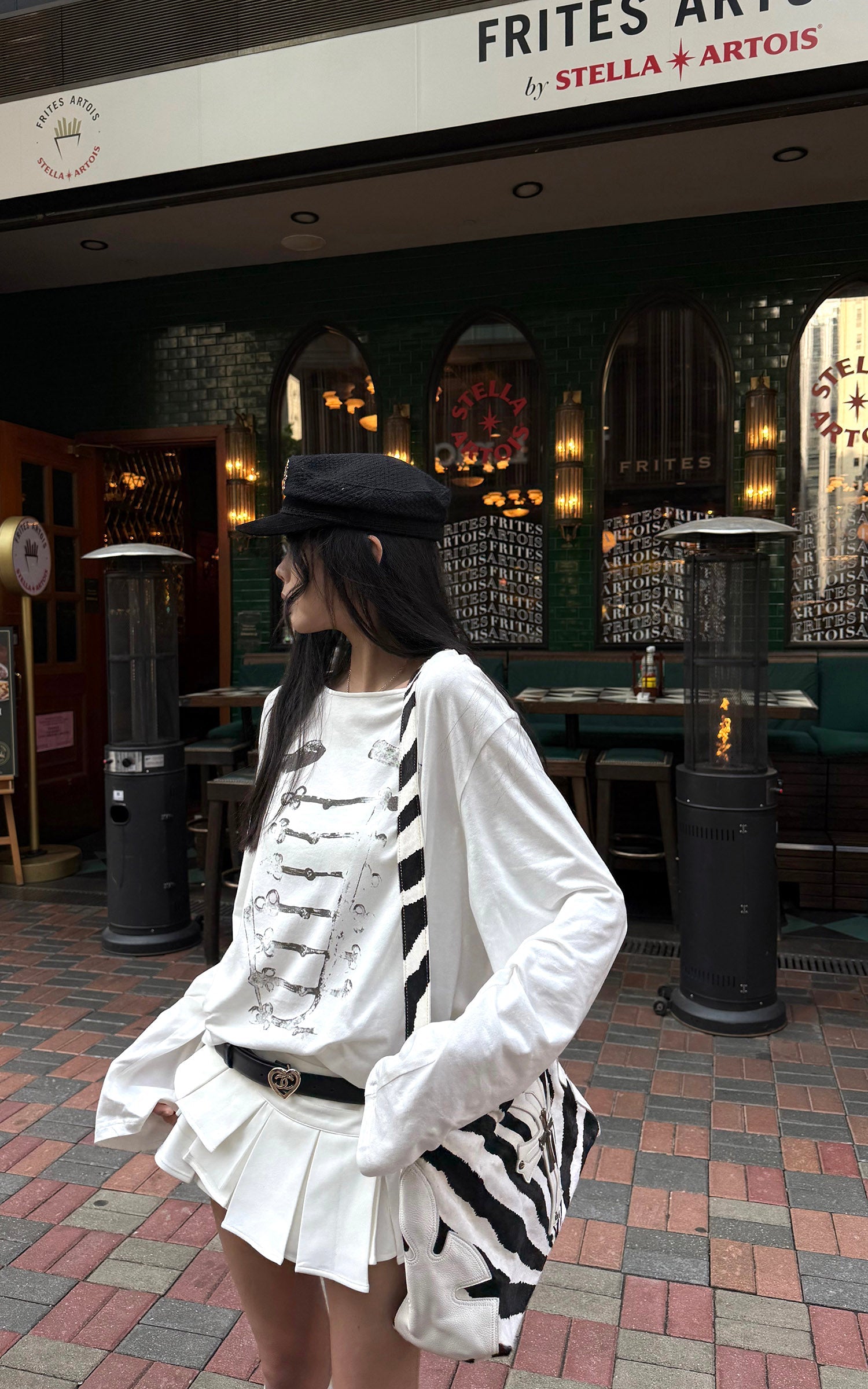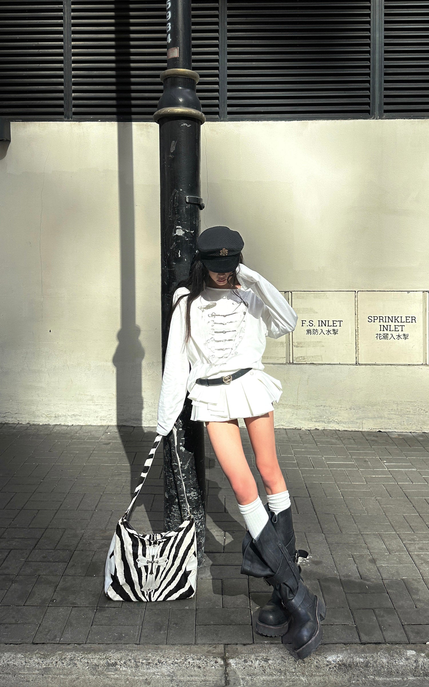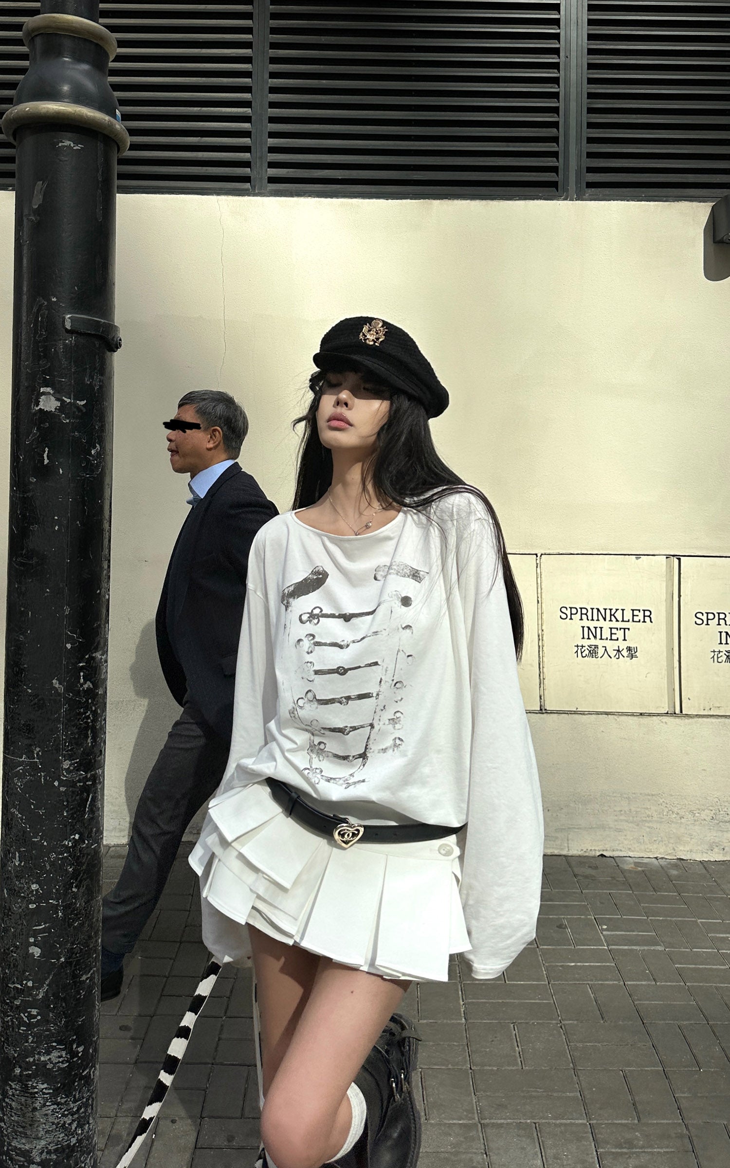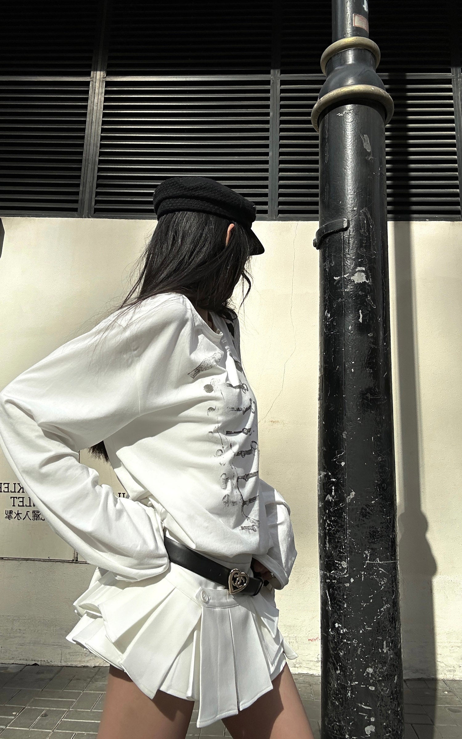 A distressed military-inspired graphic disrupts the clean white base, creating subtle yet sharp visual tension. The relaxed drop-shoulder silhouette drapes effortlessly, while the loose neckline adds an undone edge. Crafted from soft, breathable fabric, it styles seamlessly on its own or layered for a cool, Y2K-infused street attitude.