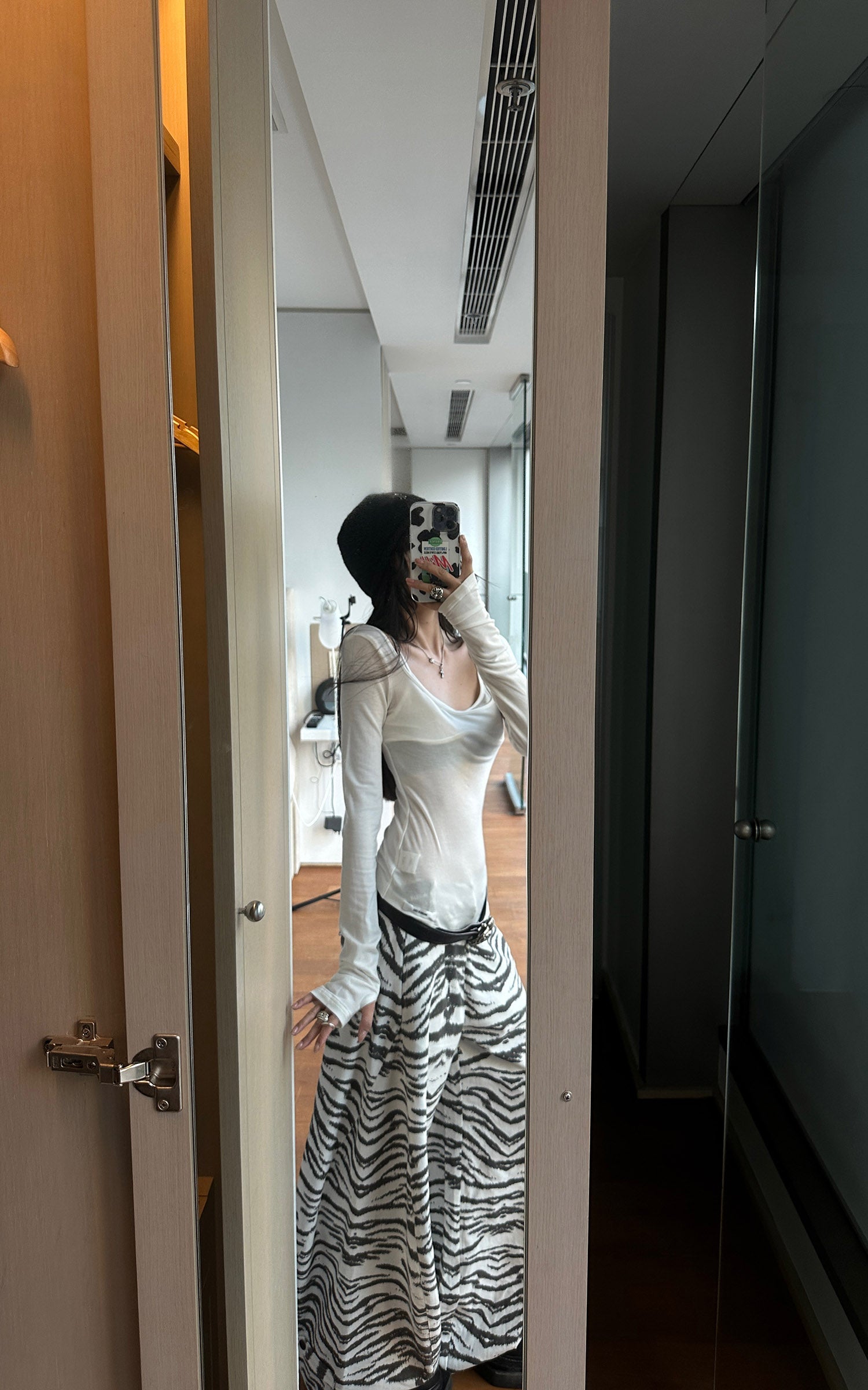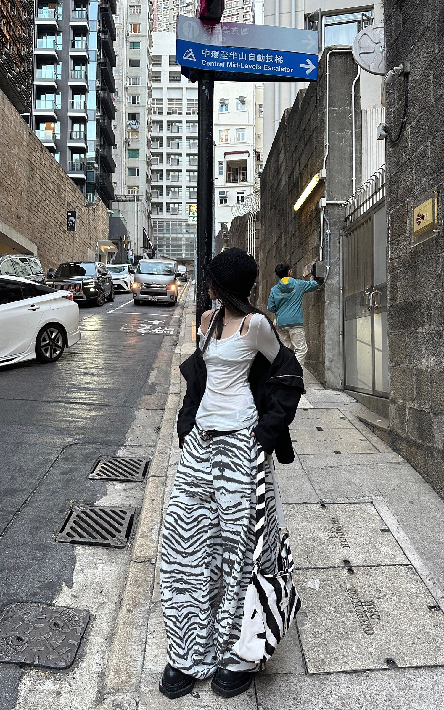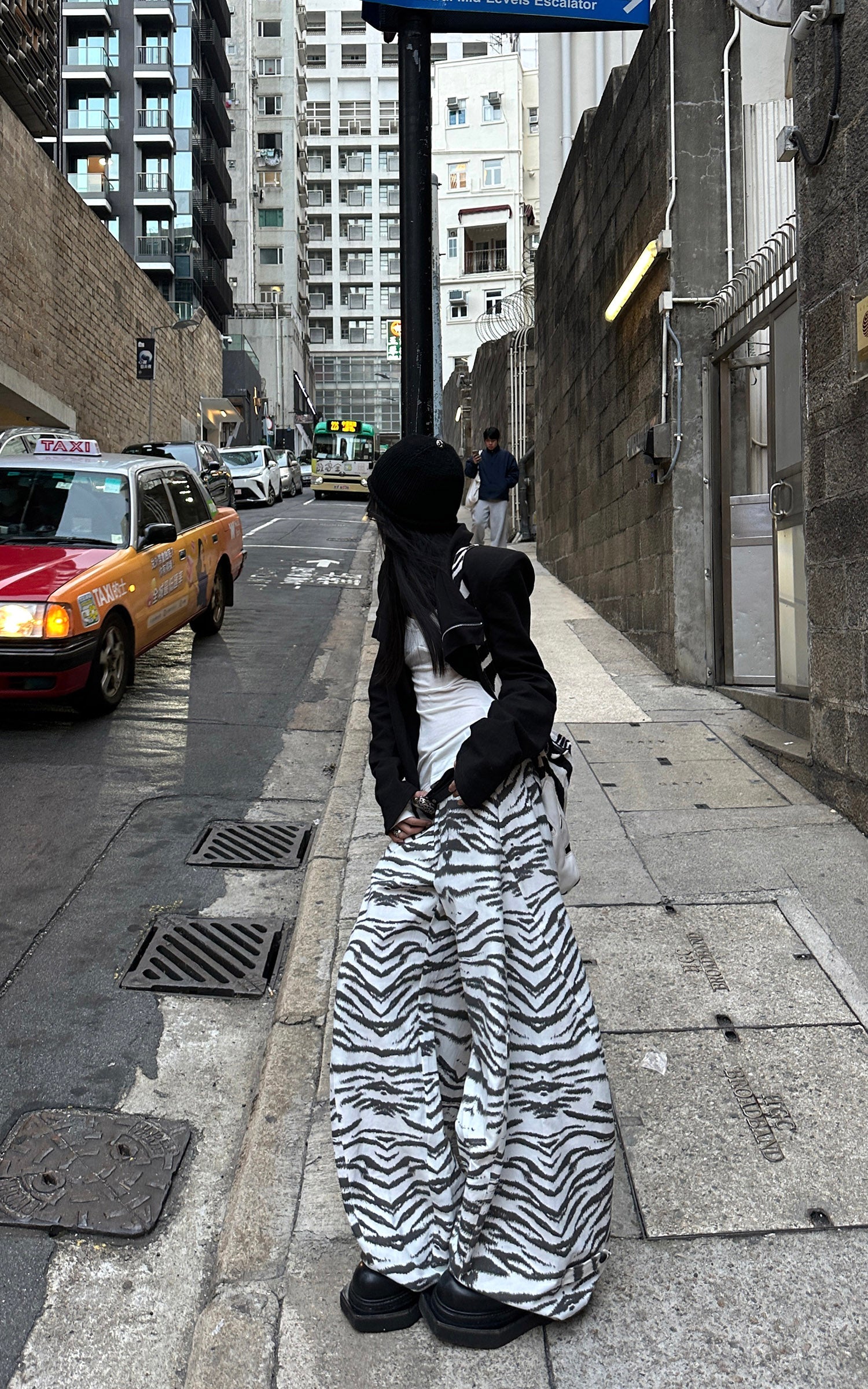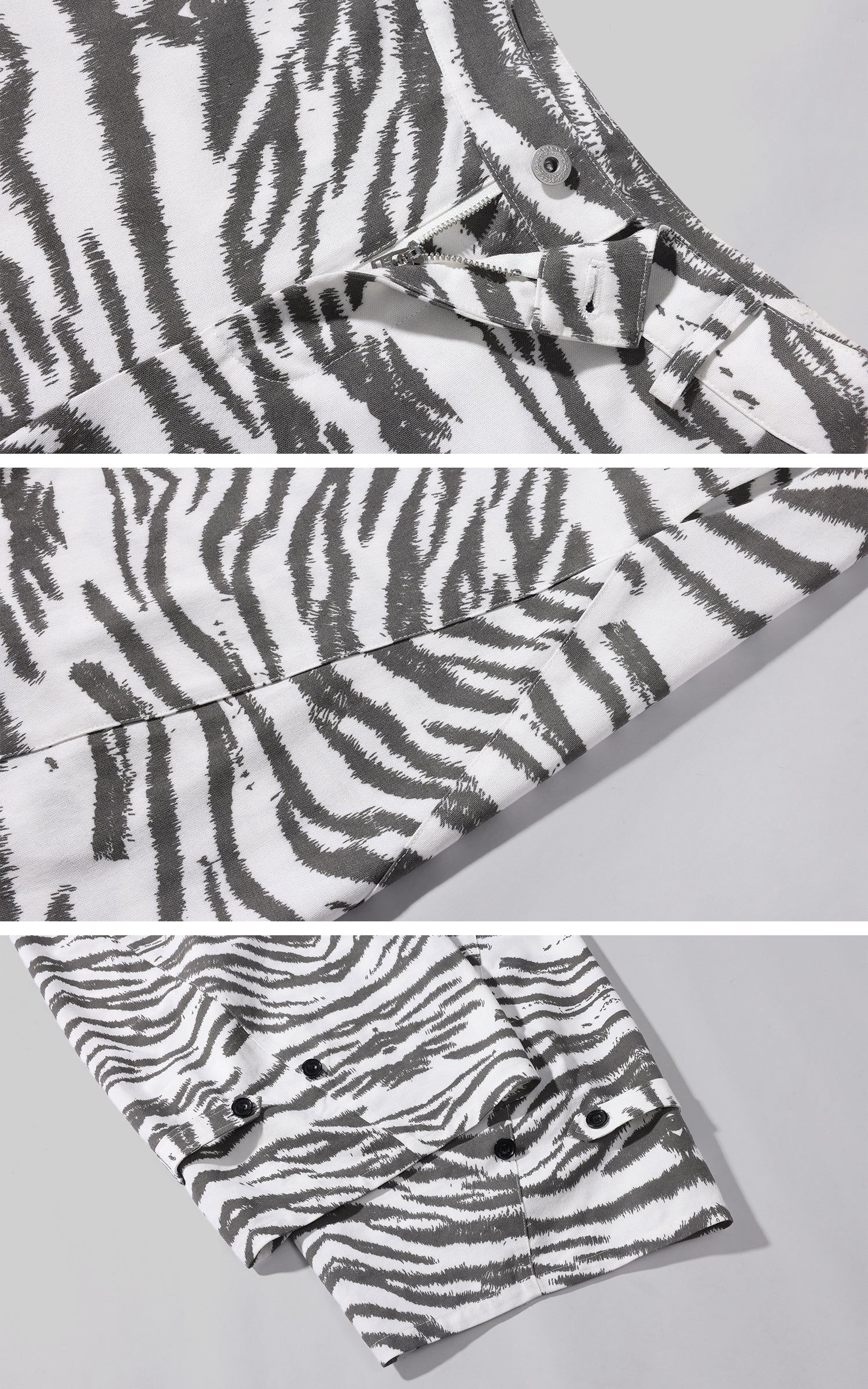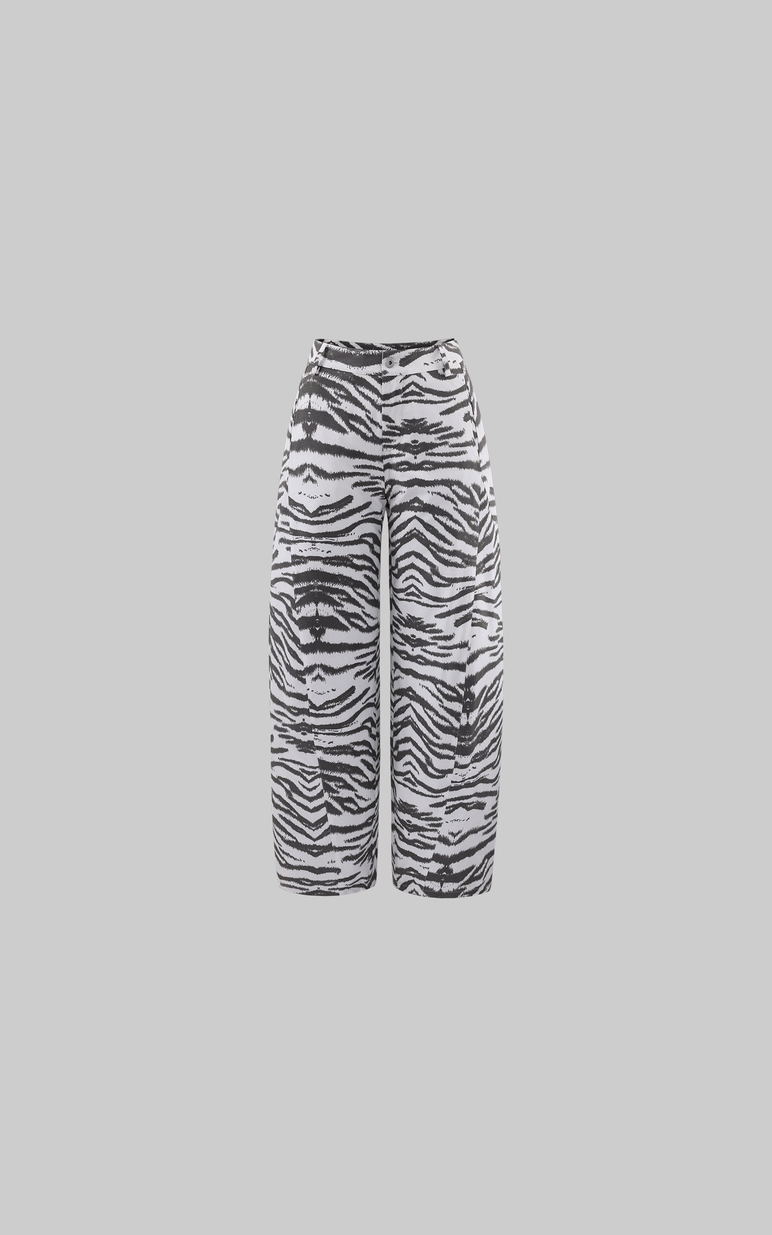 These trousers feature an all-over white zebra pattern, unfolding across the surface like natural markings shaped by growth rather than design. The high-rise waist anchors the body, while wide legs extend downward with steady volume, allowing the pattern to shift subtly with movement. The fabric maintains structure without stiffness, preserving the silhouette in a relaxed state. Rather than functioning as ornament, the zebra motif becomes a boundary between body and space—controlled, instinctive, and quietly assertive.