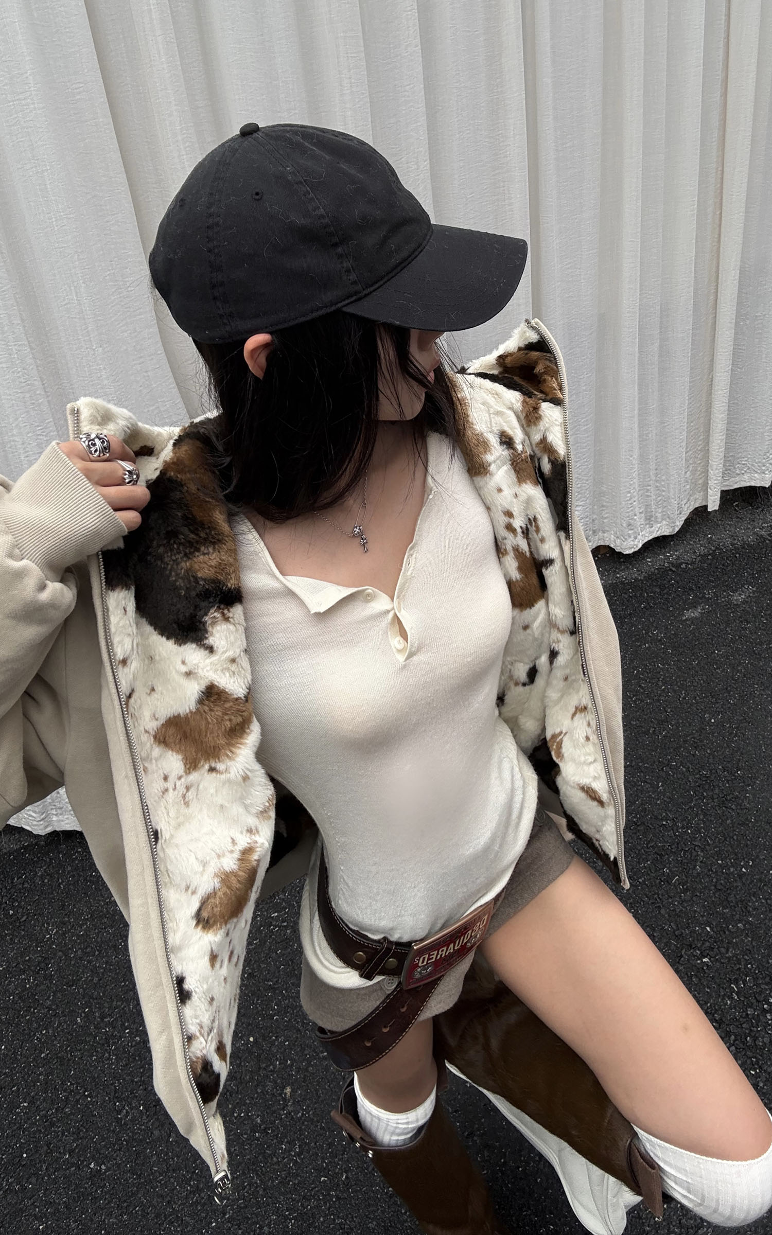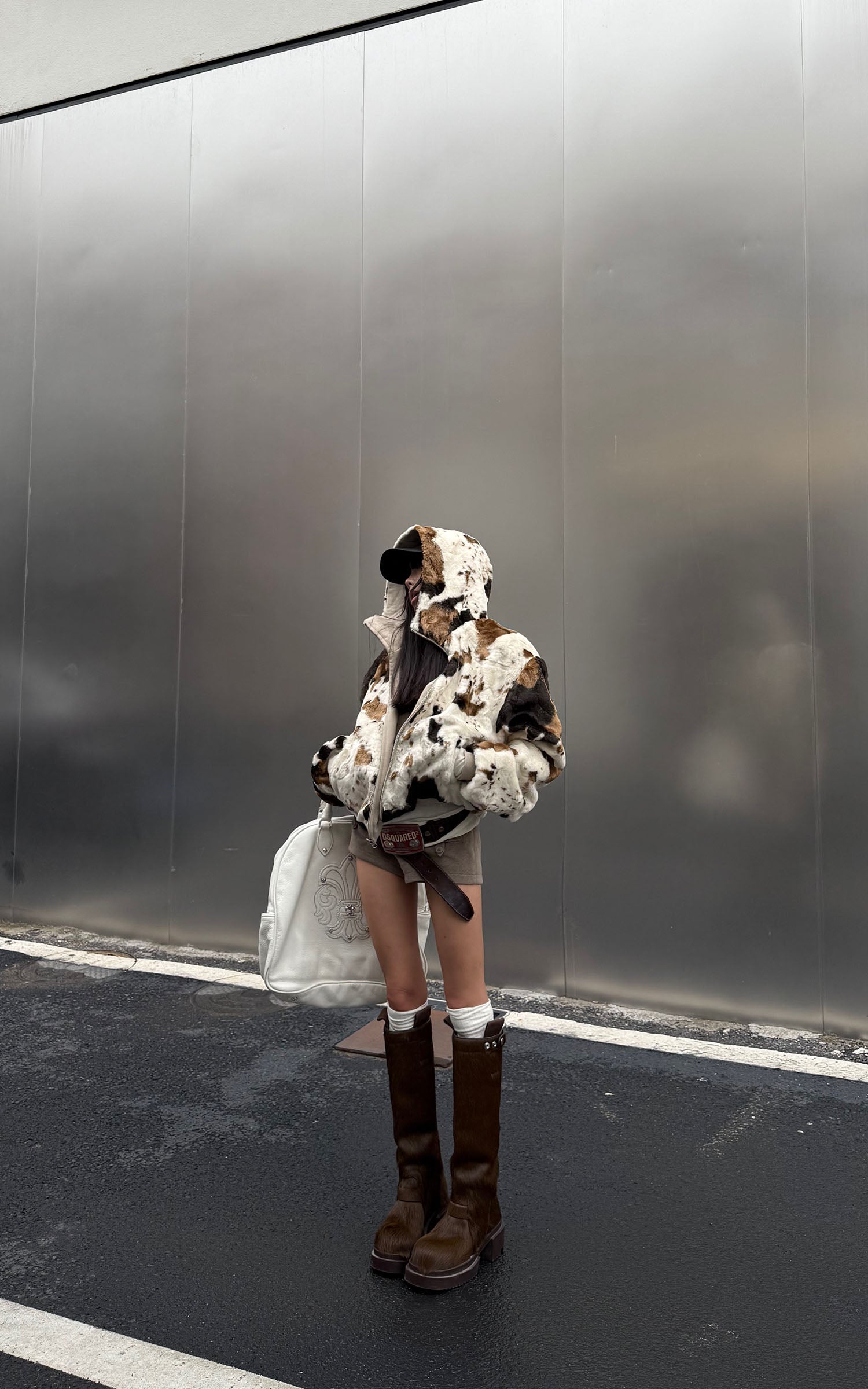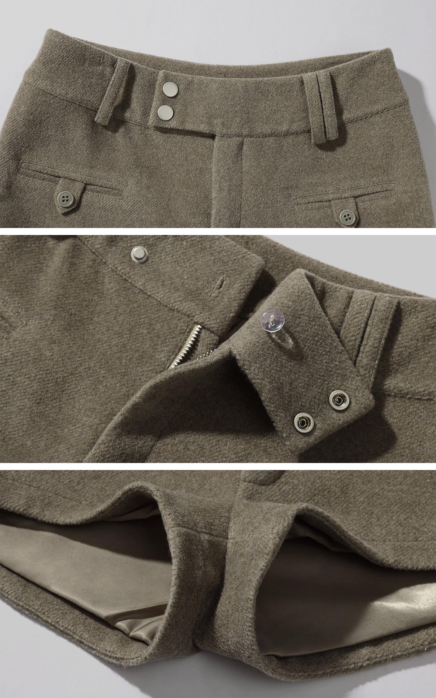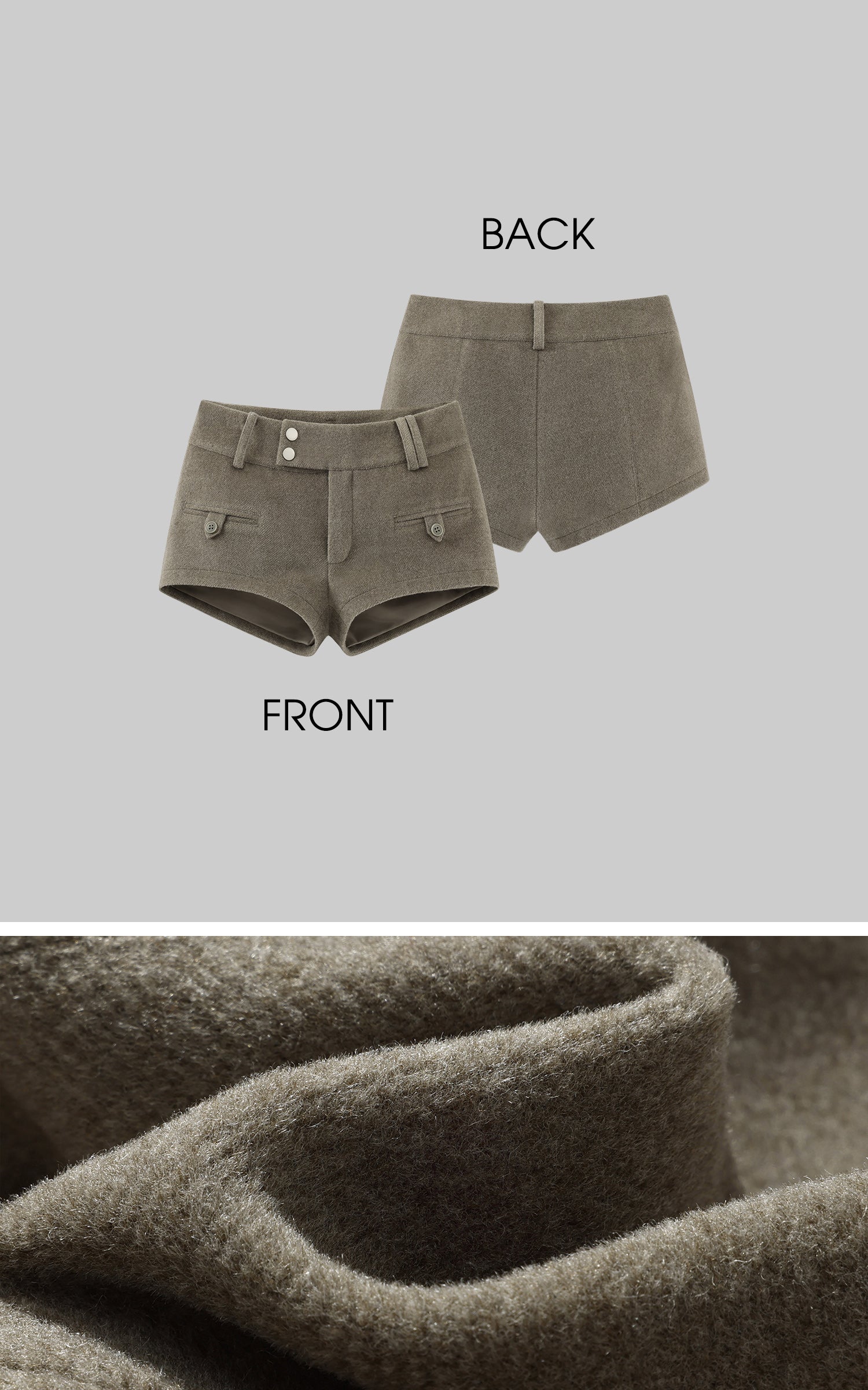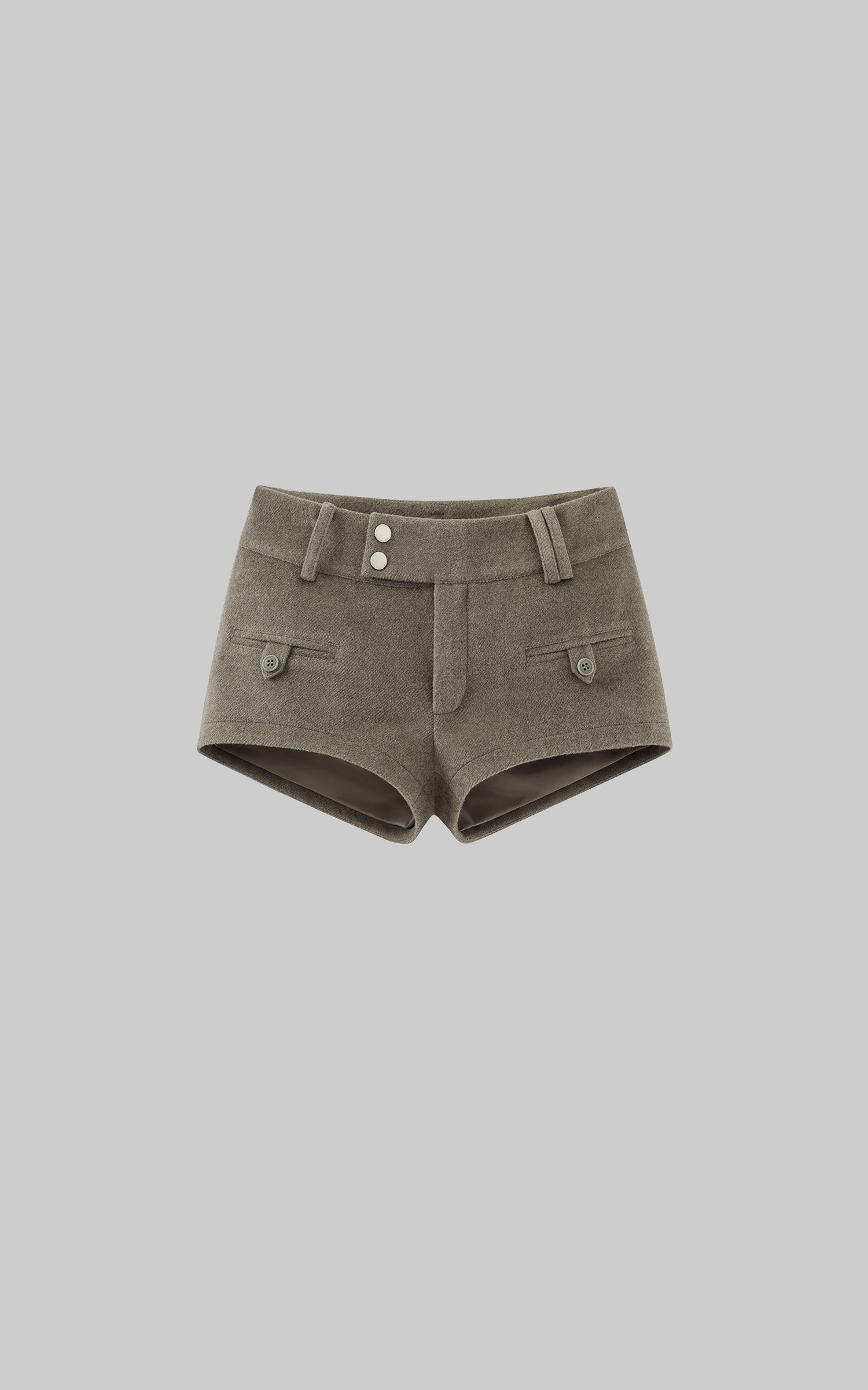 Tailored with a wool-like textured fabric, these structured shorts balance minimalism and strength. The double-button waistband and flap pockets add utility detailing, while the fitted high-waist silhouette refines proportion and attitude. Pair with an oversized hoodie or cropped jacket for a clean, urban edge.