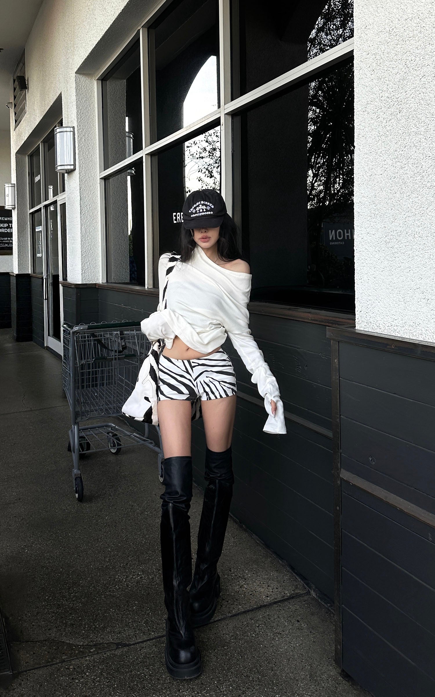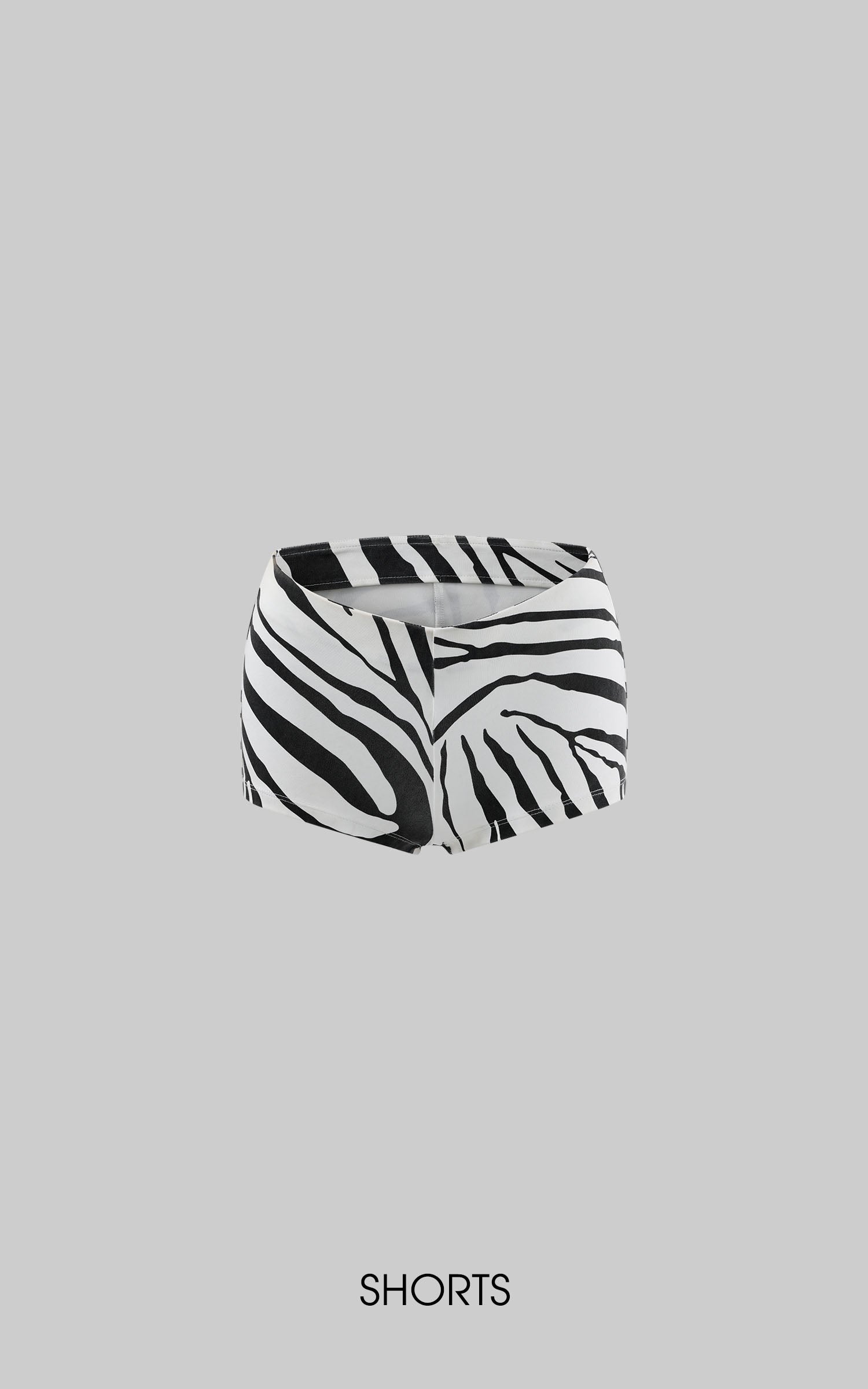 A bold zebra pattern reworks classic micro shorts with a sharp graphic attitude. The low-rise cut and clean silhouette contour the body while keeping the look minimal and effortless. Soft stretch fabric moves with ease, designed to pair with oversized tops, cropped layers, or statement boots.
