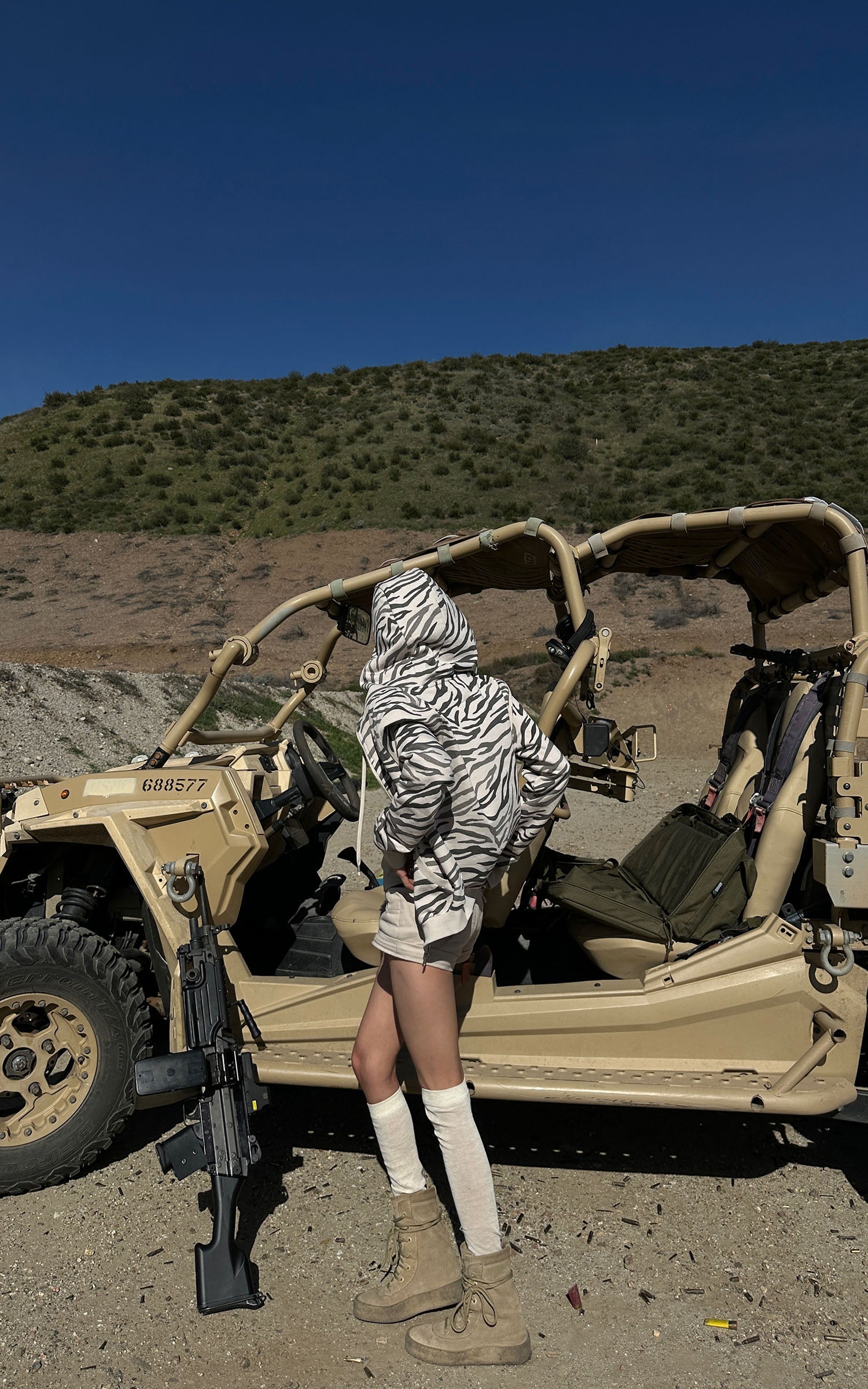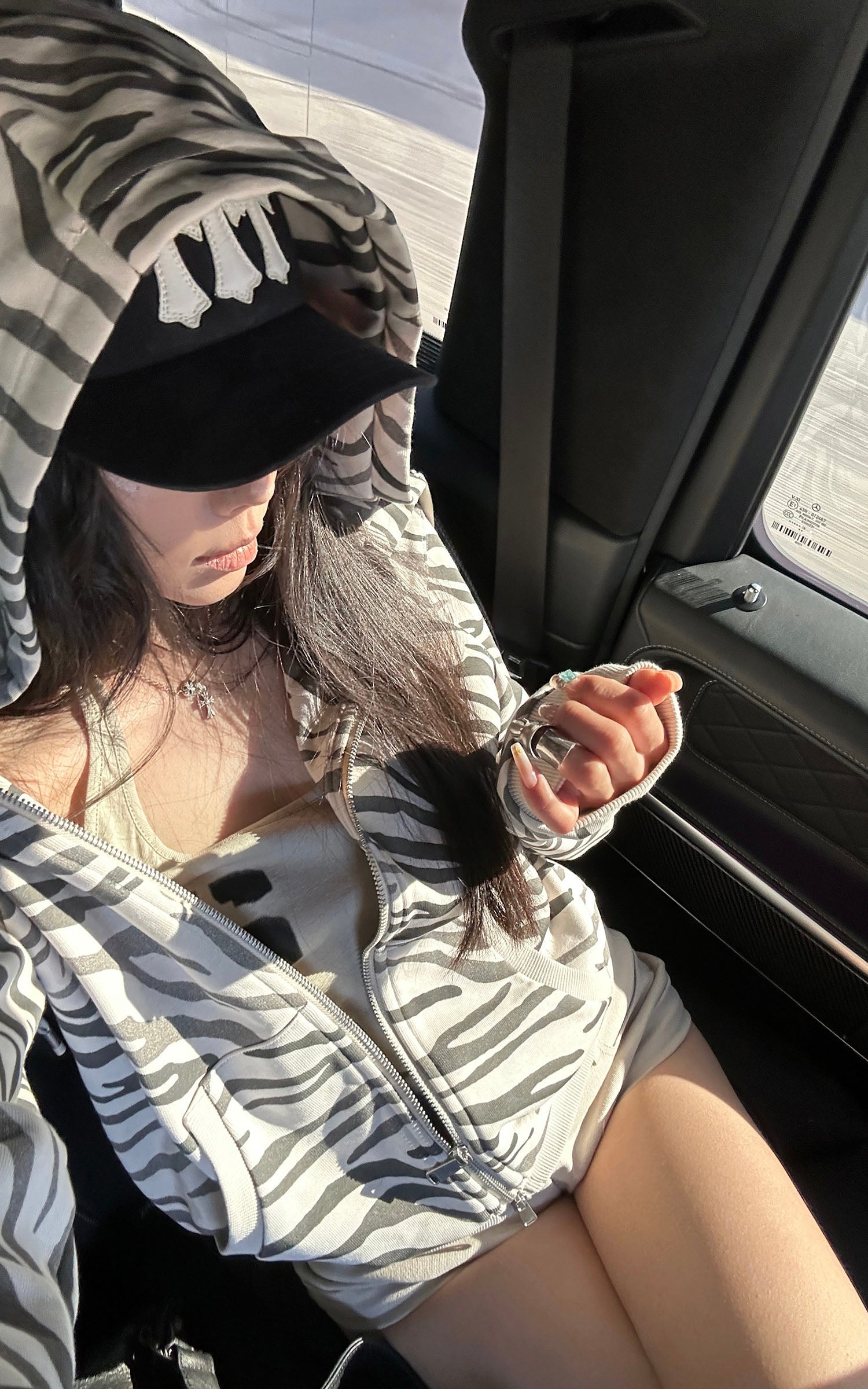 A relaxed zip-up hoodie featuring a bold zebra pattern that brings a sharp graphic edge to everyday layering. The soft cotton blend structure keeps the silhouette clean while maintaining comfort. Designed with a drawstring hood, ribbed trims, and a front pocket for functional detail. The slightly cropped fit pairs effortlessly with shorts, denim, or layered street looks.